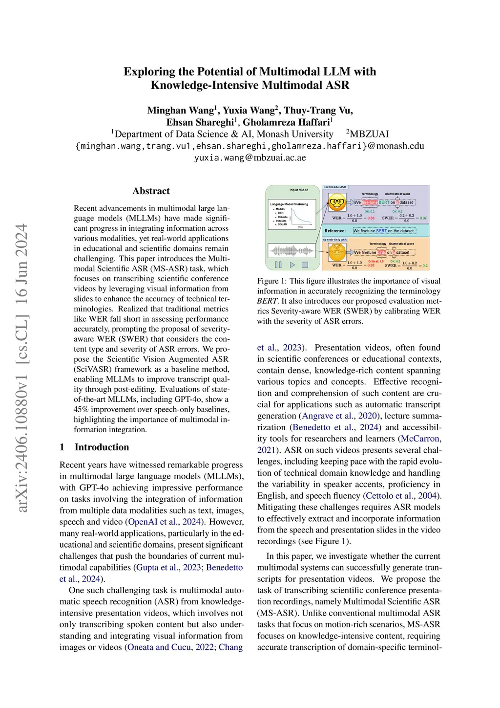 Recent advancements in multimodal large language models (MLLMs) have made significant progress in integrating information across various modalities, yet real-world applications in educational and scientific domains remain challenging. This paper introduces the Multimodal Scientific ASR (MS-ASR) task, which focuses on transcribing scientific conference videos by leveraging visual information from slides to enhance the accuracy of technical terminologies. Realized that traditional metrics like WER fall short in assessing performance accurately, prompting the proposal of severity-aware WER (SWER) that considers the content type and severity of ASR errors. We propose the Scientific Vision Augmented ASR (SciVASR) framework as a baseline method, enabling MLLMs to improve transcript quality through post-editing. Evaluations of state-of-the-art MLLMs, including GPT-4o, show a 45% improvement over speech-only baselines, highlighting the importance of multimodal information integration.