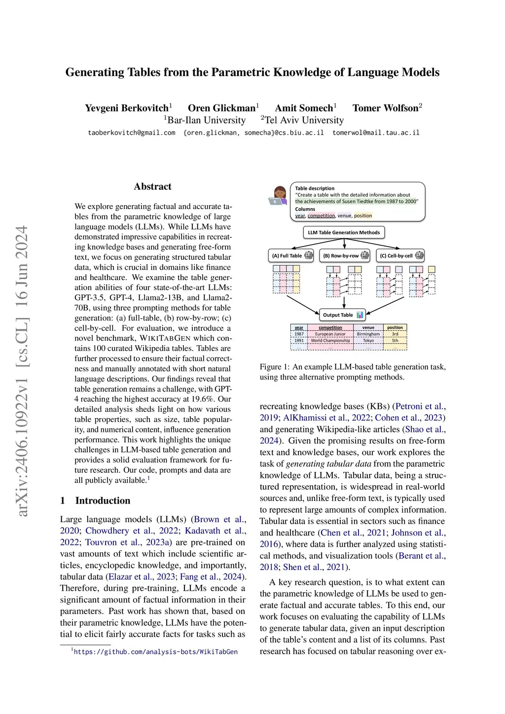 We explore generating factual and accurate tables from the parametric knowledge of large language models (LLMs). While LLMs have demonstrated impressive capabilities in recreating knowledge bases and generating free-form text, we focus on generating structured tabular data, which is crucial in domains like finance and healthcare. We examine the table generation abilities of four state-of-the-art LLMs: GPT-3.5, GPT-4, Llama2-13B, and Llama2-70B, using three prompting methods for table generation: (a) full-table, (b) row-by-row; (c) cell-by-cell. For evaluation, we introduce a novel benchmark, WikiTabGen which contains 100 curated Wikipedia tables. Tables are further processed to ensure their factual correctness and manually annotated with short natural language descriptions. Our findings reveal that table generation remains a challenge, with GPT-4 reaching the highest accuracy at 19.6%. Our detailed analysis sheds light on how various table properties, such as size, table popularity, and numerical content, influence generation performance. This work highlights the unique challenges in LLM-based table generation and provides a solid evaluation framework for future research. Our code, prompts and data are all publicly available: https://github.com/analysis-bots/WikiTabGen