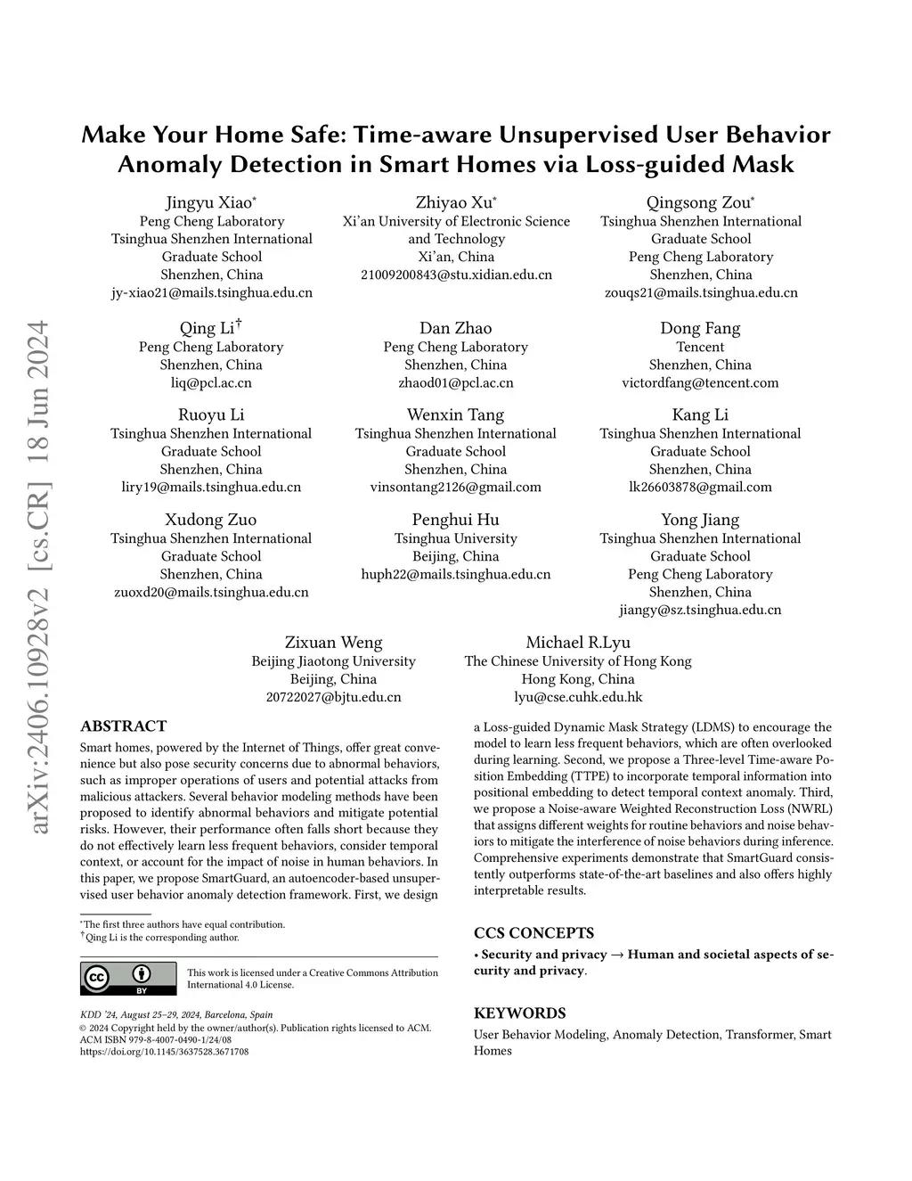 Smart homes, powered by the Internet of Things, offer great convenience but also pose security concerns due to abnormal behaviors, such as improper operations of users and potential attacks from malicious attackers. Several behavior modeling methods have been proposed to identify abnormal behaviors and mitigate potential risks. However, their performance often falls short because they do not effectively learn less frequent behaviors, consider temporal context, or account for the impact of noise in human behaviors. In this paper, we propose SmartGuard, an autoencoder-based unsupervised user behavior anomaly detection framework. First, we design a Loss-guided Dynamic Mask Strategy (LDMS) to encourage the model to learn less frequent behaviors, which are often overlooked during learning. Second, we propose a Three-level Time-aware Position Embedding (TTPE) to incorporate temporal information into positional embedding to detect temporal context anomaly. Third, we propose a Noise-aware Weighted Reconstruction Loss (NWRL) that assigns different weights for routine behaviors and noise behaviors to mitigate the interference of noise behaviors during inference. Comprehensive experiments on three datasets with ten types of anomaly behaviors demonstrates that SmartGuard consistently outperforms state-of-the-art baselines and also offers highly interpretable results.