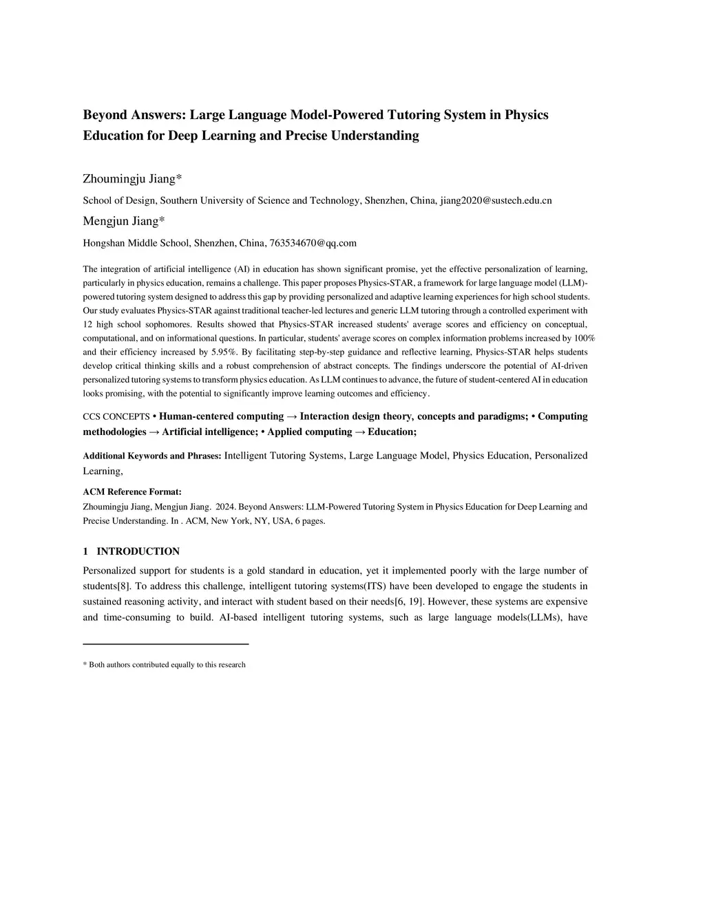 The integration of artificial intelligence (AI) in education has shown significant promise, yet the effective personalization of learning, particularly in physics education, remains a challenge. This paper proposes Physics-STAR, a framework for large language model (LLM)- powered tutoring system designed to address this gap by providing personalized and adaptive learning experiences for high school students. Our study evaluates Physics-STAR against traditional teacher-led lectures and generic LLM tutoring through a controlled experiment with 12 high school sophomores. Results showed that Physics-STAR increased students' average scores and efficiency on conceptual, computational, and on informational questions. In particular, students' average scores on complex information problems increased by 100% and their efficiency increased by 5.95%. By facilitating step-by-step guidance and reflective learning, Physics-STAR helps students develop critical thinking skills and a robust comprehension of abstract concepts. The findings underscore the potential of AI-driven personalized tutoring systems to transform physics education. As LLM continues to advance, the future of student-centered AI in education looks promising, with the potential to significantly improve learning outcomes and efficiency.