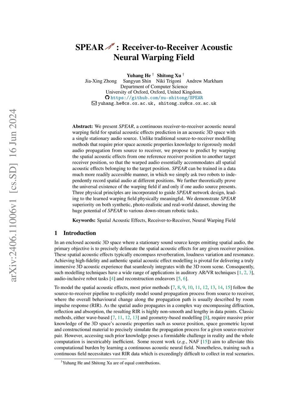 We present SPEAR, a continuous receiver-to-receiver acoustic neural warping field for spatial acoustic effects prediction in an acoustic 3D space with a single stationary audio source. Unlike traditional source-to-receiver modelling methods that require prior space acoustic properties knowledge to rigorously model audio propagation from source to receiver, we propose to predict by warping the spatial acoustic effects from one reference receiver position to another target receiver position, so that the warped audio essentially accommodates all spatial acoustic effects belonging to the target position. SPEAR can be trained in a data much more readily accessible manner, in which we simply ask two robots to independently record spatial audio at different positions. We further theoretically prove the universal existence of the warping field if and only if one audio source presents. Three physical principles are incorporated to guide SPEAR network design, leading to the learned warping field physically meaningful. We demonstrate SPEAR superiority on both synthetic, photo-realistic and real-world dataset, showing the huge potential of SPEAR to various down-stream robotic tasks.