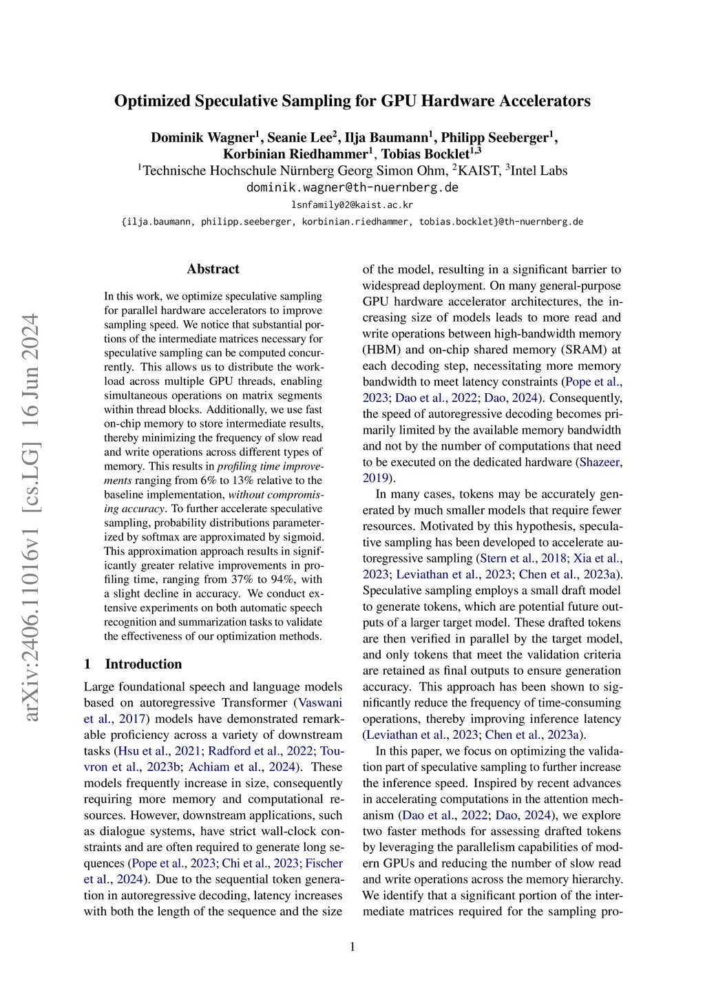 In this work, we optimize speculative sampling for parallel hardware accelerators to improve sampling speed. We notice that substantial portions of the intermediate matrices necessary for speculative sampling can be computed concurrently. This allows us to distribute the workload across multiple GPU threads, enabling simultaneous operations on matrix segments within thread blocks. Additionally, we use fast on-chip memory to store intermediate results, thereby minimizing the frequency of slow read and write operations across different types of memory. This results in profiling time improvements ranging from 6% to 13% relative to the baseline implementation, without compromising accuracy. To further accelerate speculative sampling, probability distributions parameterized by softmax are approximated by sigmoid. This approximation approach results in significantly greater relative improvements in profiling time, ranging from 37% to 94%, with a slight decline in accuracy. We conduct extensive experiments on both automatic speech recognition and summarization tasks to validate the effectiveness of our optimization methods.