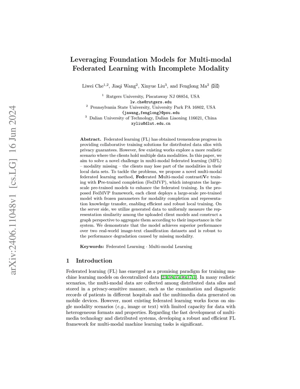 Federated learning (FL) has obtained tremendous progress in providing collaborative training solutions for distributed data silos with privacy guarantees. However, few existing works explore a more realistic scenario where the clients hold multiple data modalities. In this paper, we aim to solve a novel challenge in multi-modal federated learning (MFL) -- modality missing -- the clients may lose part of the modalities in their local data sets. To tackle the problems, we propose a novel multi-modal federated learning method, Federated Multi-modal contrastiVe training with Pre-trained completion (FedMVP), which integrates the large-scale pre-trained models to enhance the federated training. In the proposed FedMVP framework, each client deploys a large-scale pre-trained model with frozen parameters for modality completion and representation knowledge transfer, enabling efficient and robust local training. On the server side, we utilize generated data to uniformly measure the representation similarity among the uploaded client models and construct a graph perspective to aggregate them according to their importance in the system. We demonstrate that the model achieves superior performance over two real-world image-text classification datasets and is robust to the performance degradation caused by missing modality.