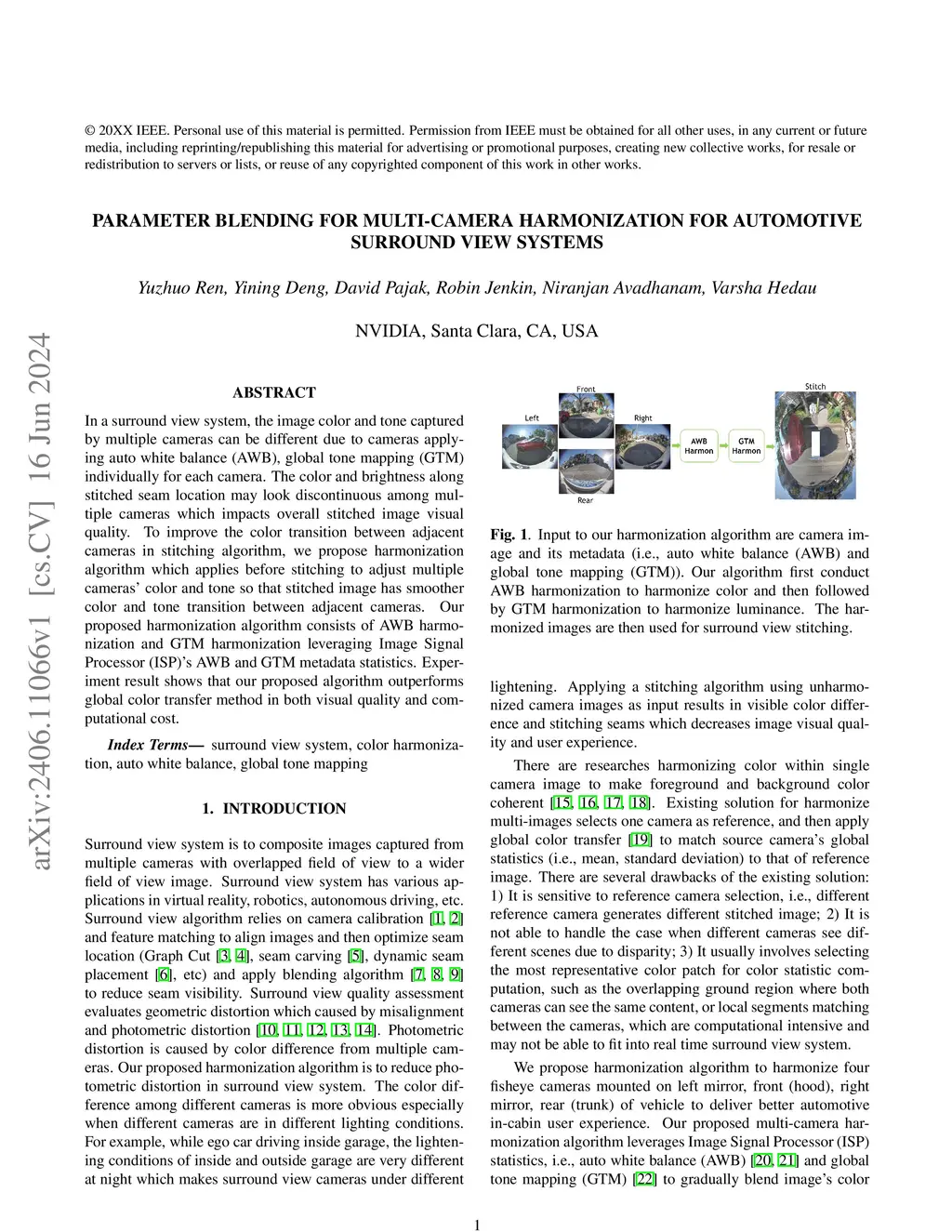 In a surround view system, the image color and tone captured by multiple cameras can be different due to cameras applying auto white balance (AWB), global tone mapping (GTM) individually for each camera. The color and brightness along stitched seam location may look discontinuous among multiple cameras which impacts overall stitched image visual quality. To improve the color transition between adjacent cameras in stitching algorithm, we propose harmonization algorithm which applies before stitching to adjust multiple cameras' color and tone so that stitched image has smoother color and tone transition between adjacent cameras. Our proposed harmonization algorithm consists of AWB harmonization and GTM harmonization leveraging Image Signal Processor (ISP)'s AWB and GTM metadata statistics. Experiment result shows that our proposed algorithm outperforms global color transfer method in both visual quality and computational cost.