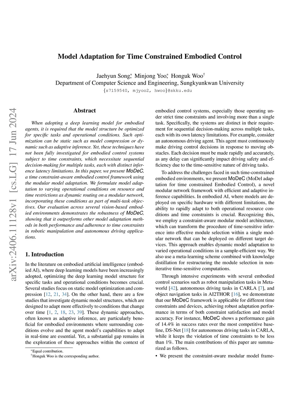 When adopting a deep learning model for embodied agents, it is required that the model structure be optimized for specific tasks and operational conditions. Such optimization can be static such as model compression or dynamic such as adaptive inference. Yet, these techniques have not been fully investigated for embodied control systems subject to time constraints, which necessitate sequential decision-making for multiple tasks, each with distinct inference latency limitations. In this paper, we present MoDeC, a time constraint-aware embodied control framework using the modular model adaptation. We formulate model adaptation to varying operational conditions on resource and time restrictions as dynamic routing on a modular network, incorporating these conditions as part of multi-task objectives. Our evaluation across several vision-based embodied environments demonstrates the robustness of MoDeC, showing that it outperforms other model adaptation methods in both performance and adherence to time constraints in robotic manipulation and autonomous driving applications
