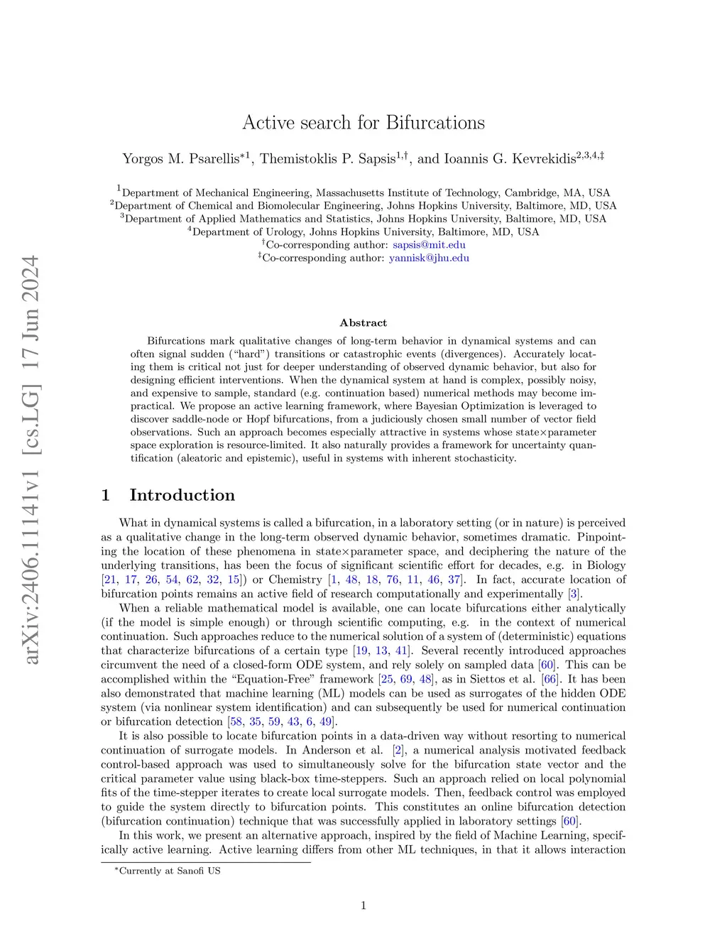 Bifurcations mark qualitative changes of long-term behavior in dynamical systems and can often signal sudden ("hard") transitions or catastrophic events (divergences). Accurately locating them is critical not just for deeper understanding of observed dynamic behavior, but also for designing efficient interventions. When the dynamical system at hand is complex, possibly noisy, and expensive to sample, standard (e.g. continuation based) numerical methods may become impractical. We propose an active learning framework, where Bayesian Optimization is leveraged to discover saddle-node or Hopf bifurcations, from a judiciously chosen small number of vector field observations. Such an approach becomes especially attractive in systems whose state x parameter space exploration is resource-limited. It also naturally provides a framework for uncertainty quantification (aleatoric and epistemic), useful in systems with inherent stochasticity.