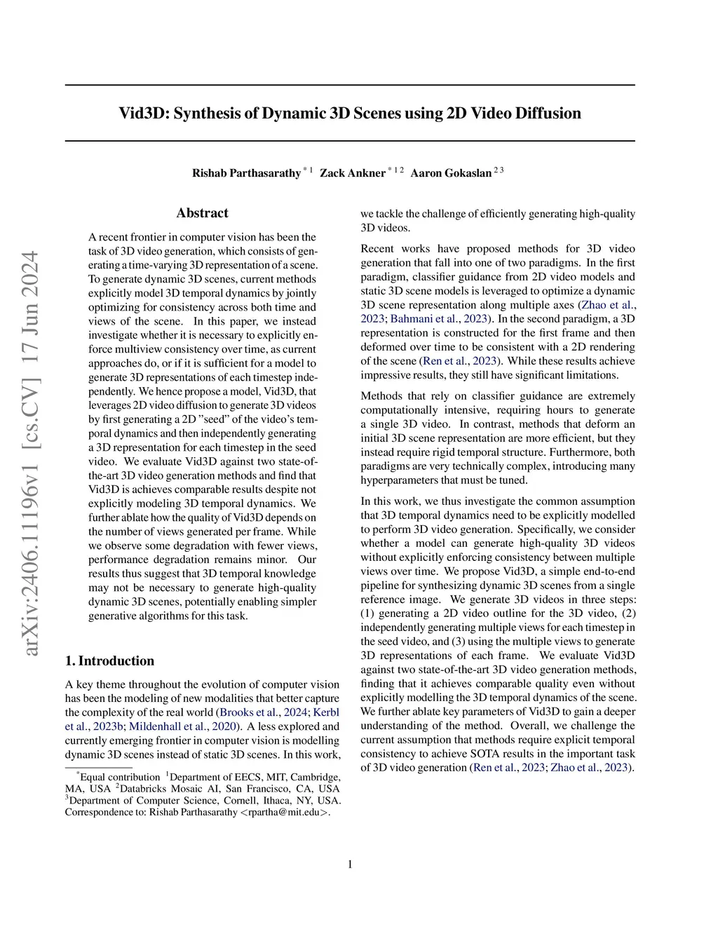 A recent frontier in computer vision has been the task of 3D video generation, which consists of generating a time-varying 3D representation of a scene. To generate dynamic 3D scenes, current methods explicitly model 3D temporal dynamics by jointly optimizing for consistency across both time and views of the scene. In this paper, we instead investigate whether it is necessary to explicitly enforce multiview consistency over time, as current approaches do, or if it is sufficient for a model to generate 3D representations of each timestep independently. We hence propose a model, Vid3D, that leverages 2D video diffusion to generate 3D videos by first generating a 2D "seed" of the video's temporal dynamics and then independently generating a 3D representation for each timestep in the seed video. We evaluate Vid3D against two state-of-the-art 3D video generation methods and find that Vid3D is achieves comparable results despite not explicitly modeling 3D temporal dynamics. We further ablate how the quality of Vid3D depends on the number of views generated per frame. While we observe some degradation with fewer views, performance degradation remains minor. Our results thus suggest that 3D temporal knowledge may not be necessary to generate high-quality dynamic 3D scenes, potentially enabling simpler generative algorithms for this task.