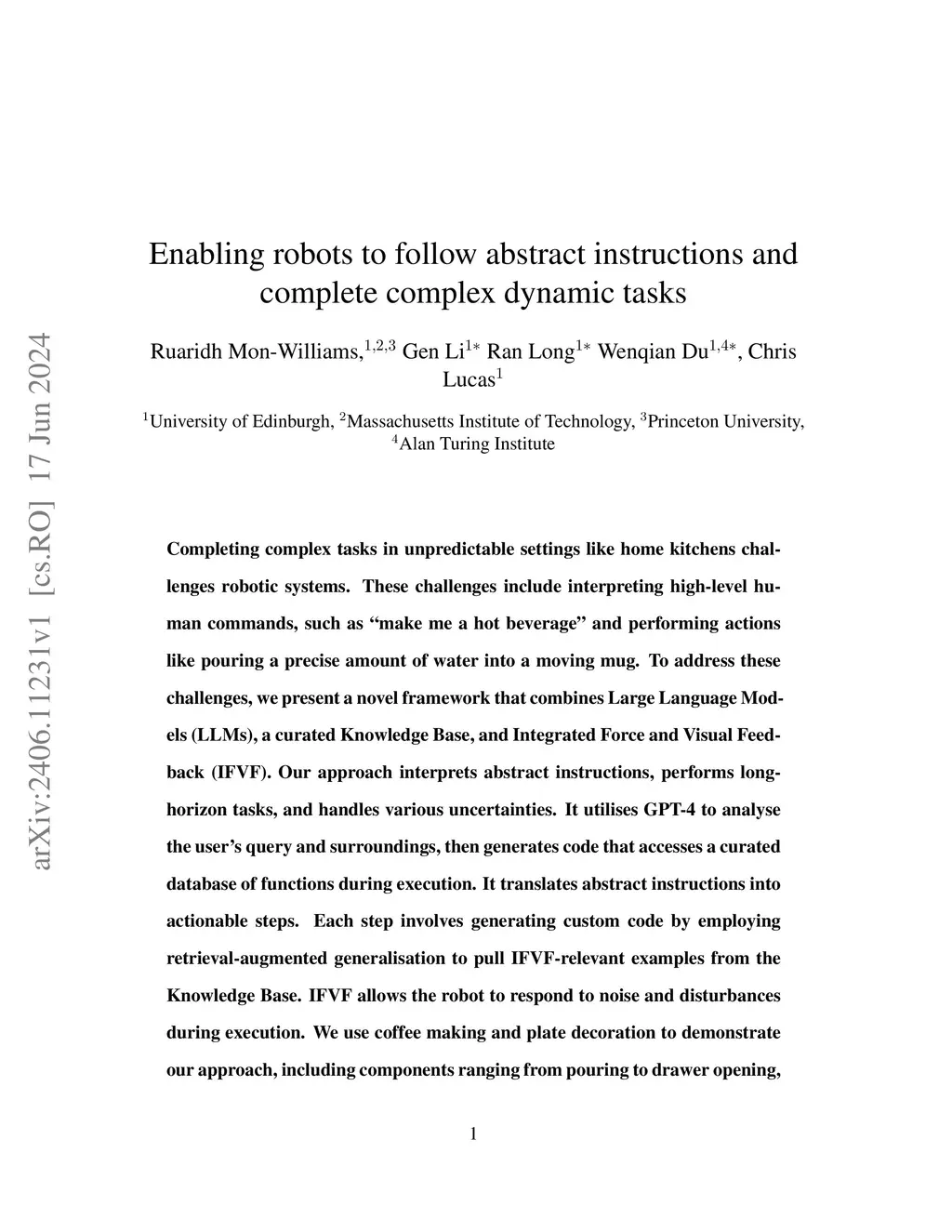 Completing complex tasks in unpredictable settings like home kitchens challenges robotic systems. These challenges include interpreting high-level human commands, such as "make me a hot beverage" and performing actions like pouring a precise amount of water into a moving mug. To address these challenges, we present a novel framework that combines Large Language Models (LLMs), a curated Knowledge Base, and Integrated Force and Visual Feedback (IFVF). Our approach interprets abstract instructions, performs long-horizon tasks, and handles various uncertainties. It utilises GPT-4 to analyse the user's query and surroundings, then generates code that accesses a curated database of functions during execution. It translates abstract instructions into actionable steps. Each step involves generating custom code by employing retrieval-augmented generalisation to pull IFVF-relevant examples from the Knowledge Base. IFVF allows the robot to respond to noise and disturbances during execution. We use coffee making and plate decoration to demonstrate our approach, including components ranging from pouring to drawer opening, each benefiting from distinct feedback types and methods. This novel advancement marks significant progress toward a scalable, efficient robotic framework for completing complex tasks in uncertain environments. Our findings are illustrated in an accompanying video and supported by an open-source GitHub repository (released upon paper acceptance).