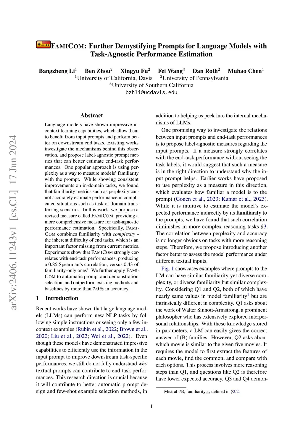 Language models have shown impressive in-context-learning capabilities, which allow them to benefit from input prompts and perform better on downstream end tasks. Existing works investigate the mechanisms behind this observation, and propose label-agnostic prompt metrics that can better estimate end-task performances. One popular approach is using perplexity as a way to measure models' familiarity with the prompt. While showing consistent improvements on in-domain tasks, we found that familiarity metrics such as perplexity cannot accurately estimate performance in complicated situations such as task or domain transferring scenarios. In this work, we propose a revised measure called FamiCom, providing a more comprehensive measure for task-agnostic performance estimation. Specifically, FamiCom combines familiarity with \textit{complexity} -- the inherent difficulty of end tasks, which is an important factor missing from current metrics. Experiments show that FamiCom strongly correlates with end-task performances, producing a 0.85 Spearman's correlation, versus 0.43 of familiarity-only ones'. We further apply FamiCom to automatic prompt and demonstration selection, and outperform existing methods and baselines by more than 7.0% in accuracy.