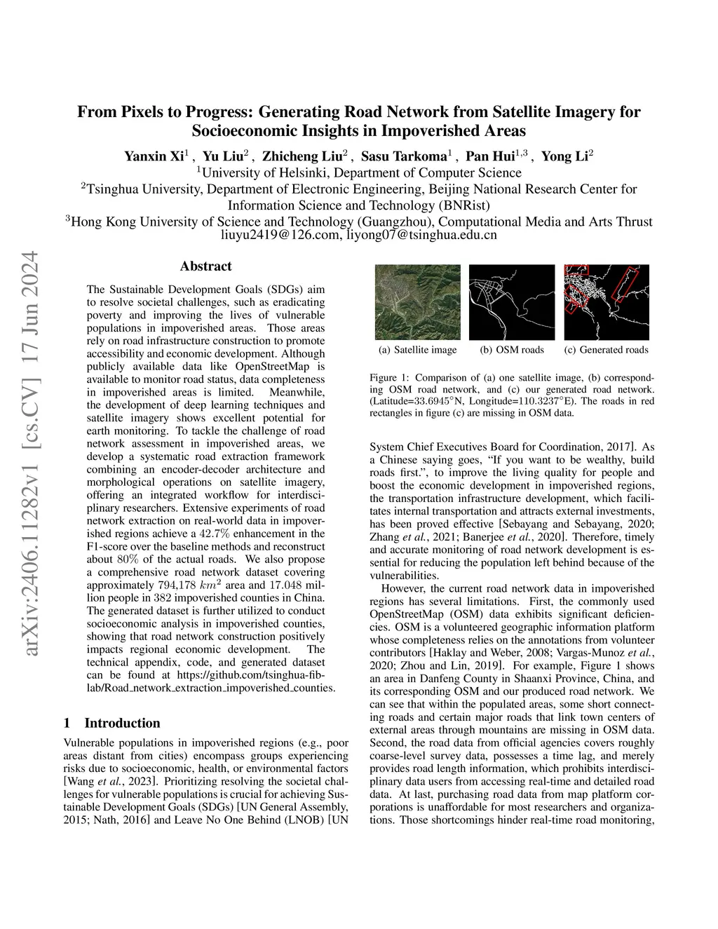 The Sustainable Development Goals (SDGs) aim to resolve societal challenges, such as eradicating poverty and improving the lives of vulnerable populations in impoverished areas. Those areas rely on road infrastructure construction to promote accessibility and economic development. Although publicly available data like OpenStreetMap is available to monitor road status, data completeness in impoverished areas is limited. Meanwhile, the development of deep learning techniques and satellite imagery shows excellent potential for earth monitoring. To tackle the challenge of road network assessment in impoverished areas, we develop a systematic road extraction framework combining an encoder-decoder architecture and morphological operations on satellite imagery, offering an integrated workflow for interdisciplinary researchers. Extensive experiments of road network extraction on real-world data in impoverished regions achieve a 42.7% enhancement in the F1-score over the baseline methods and reconstruct about 80% of the actual roads. We also propose a comprehensive road network dataset covering approximately 794,178 km2 area and 17.048 million people in 382 impoverished counties in China. The generated dataset is further utilized to conduct socioeconomic analysis in impoverished counties, showing that road network construction positively impacts regional economic development. The technical appendix, code, and generated dataset can be found at https://github.com/tsinghua-fib-lab/Road_network_extraction_impoverished_counties.