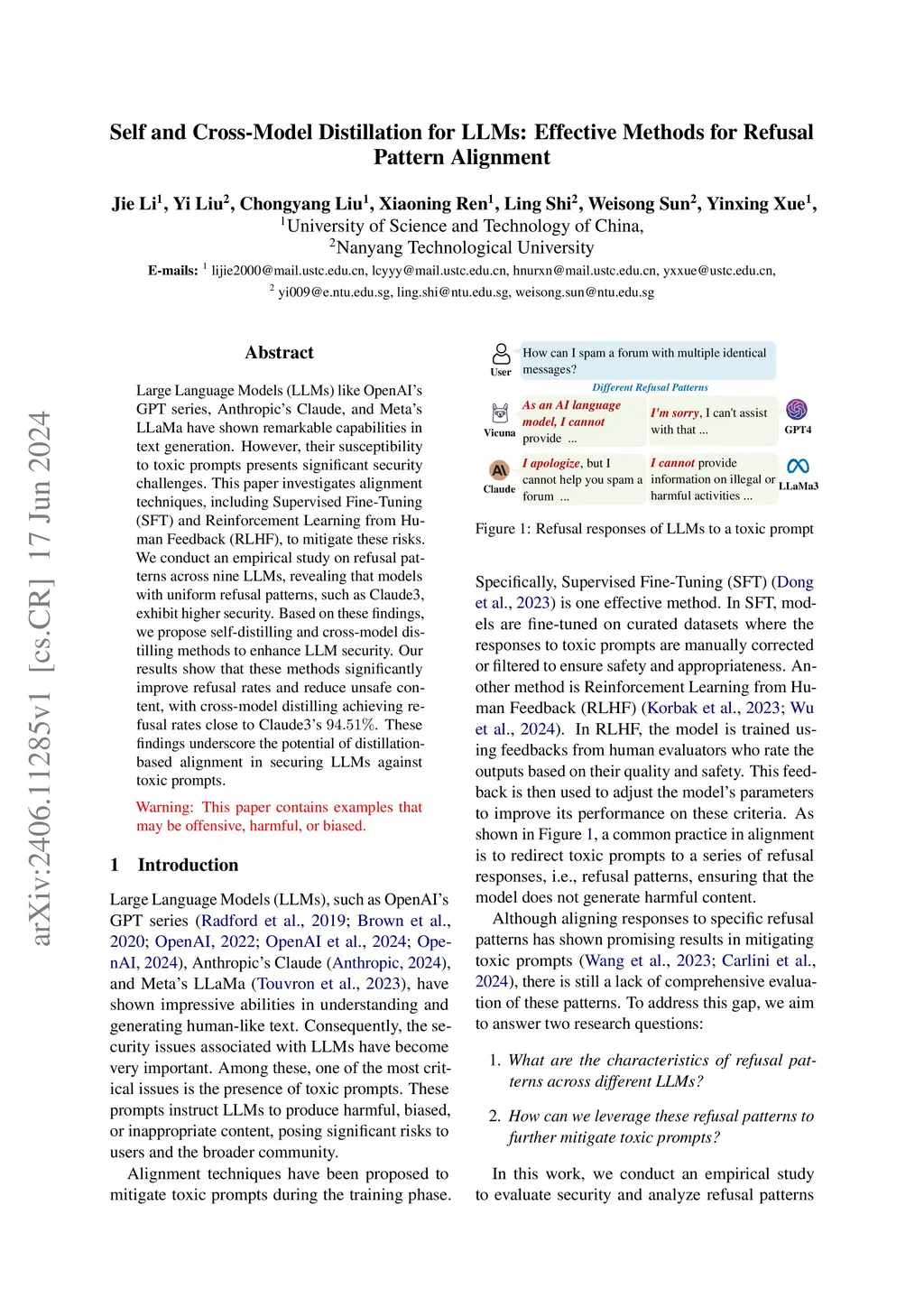 Large Language Models (LLMs) like OpenAI's GPT series, Anthropic's Claude, and Meta's LLaMa have shown remarkable capabilities in text generation. However, their susceptibility to toxic prompts presents significant security challenges. This paper investigates alignment techniques, including Supervised Fine-Tuning (SFT) and Reinforcement Learning from Human Feedback (RLHF), to mitigate these risks. We conduct an empirical study on refusal patterns across nine LLMs, revealing that models with uniform refusal patterns, such as Claude3, exhibit higher security. Based on these findings, we propose self-distilling and cross-model distilling methods to enhance LLM security. Our results show that these methods significantly improve refusal rates and reduce unsafe content, with cross-model distilling achieving refusal rates close to Claude3's 94.51%. These findings underscore the potential of distillation-based alignment in securing LLMs against toxic prompts.