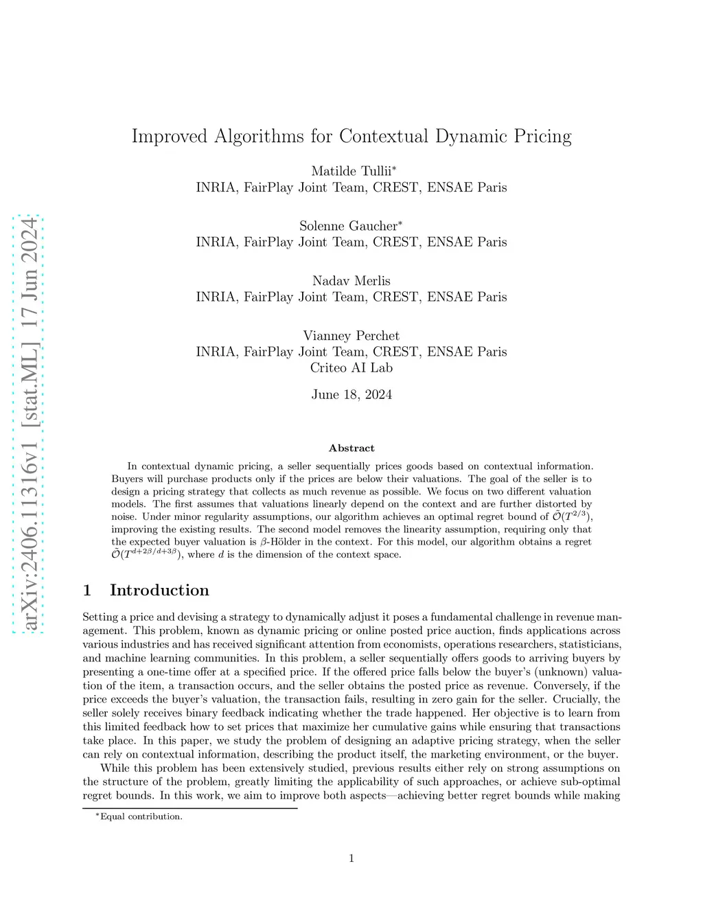 In contextual dynamic pricing, a seller sequentially prices goods based on contextual information. Buyers will purchase products only if the prices are below their valuations. The goal of the seller is to design a pricing strategy that collects as much revenue as possible. We focus on two different valuation models. The first assumes that valuations linearly depend on the context and are further distorted by noise. Under minor regularity assumptions, our algorithm achieves an optimal regret bound of , improving the existing results. The second model removes the linearity assumption, requiring only that the expected buyer valuation is -Hölder in the context. For this model, our algorithm obtains a regret , where is the dimension of the context space.