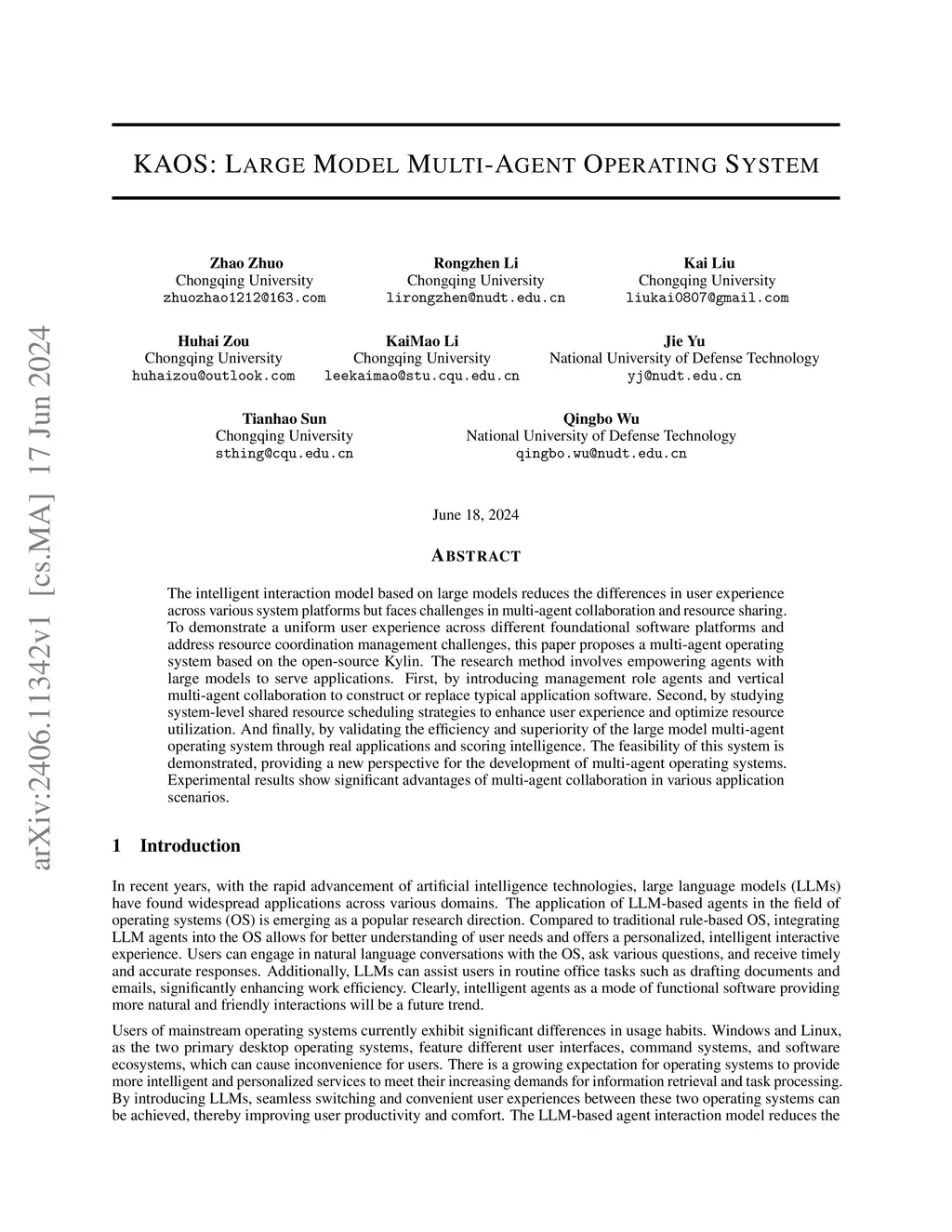 The intelligent interaction model based on large models reduces the differences in user experience across various system platforms but faces challenges in multi-agent collaboration and resource sharing. To demonstrate a uniform user experience across different foundational software platforms and address resource coordination management challenges, this paper proposes KAOS, a multi-agent operating system based on the open-source Kylin. The research method involves empowering agents with large models to serve applications. First, by introducing management role agents and vertical multi-agent collaboration to construct or replace typical application software. Second, by studying system-level shared resource scheduling strategies to enhance user experience and optimize resource utilization. And finally, by validating the efficiency and superiority of the large model multi-agent operating system through real applications and scoring intelligence. The feasibility of this system is demonstrated, providing a new perspective for the development of multi-agent operating systems. Experimental results show significant advantages of multi-agent collaboration in various application scenarios.