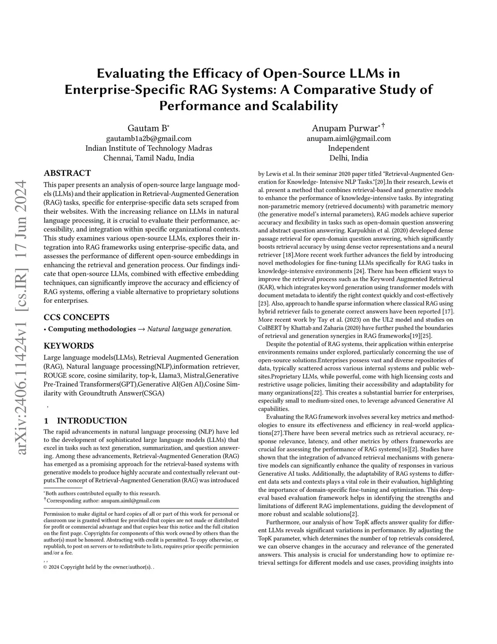 This paper presents an analysis of open-source large language models (LLMs) and their application in Retrieval-Augmented Generation (RAG) tasks, specific for enterprise-specific data sets scraped from their websites. With the increasing reliance on LLMs in natural language processing, it is crucial to evaluate their performance, accessibility, and integration within specific organizational contexts. This study examines various open-source LLMs, explores their integration into RAG frameworks using enterprise-specific data, and assesses the performance of different open-source embeddings in enhancing the retrieval and generation process. Our findings indicate that open-source LLMs, combined with effective embedding techniques, can significantly improve the accuracy and efficiency of RAG systems, offering a viable alternative to proprietary solutions for enterprises.
