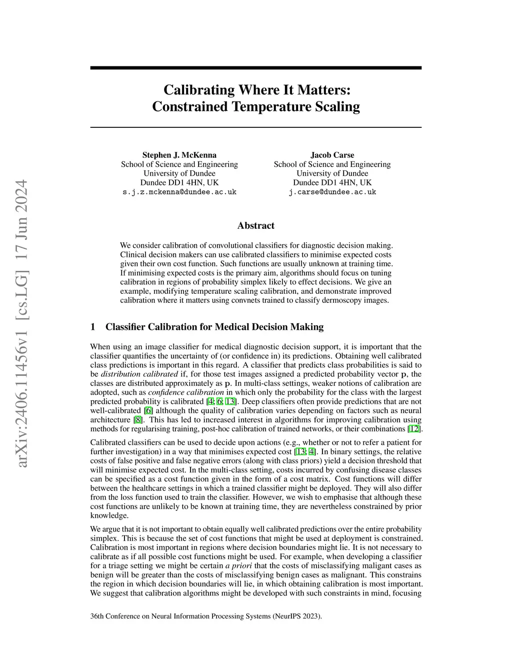 We consider calibration of convolutional classifiers for diagnostic decision making. Clinical decision makers can use calibrated classifiers to minimise expected costs given their own cost function. Such functions are usually unknown at training time. If minimising expected costs is the primary aim, algorithms should focus on tuning calibration in regions of probability simplex likely to effect decisions. We give an example, modifying temperature scaling calibration, and demonstrate improved calibration where it matters using convnets trained to classify dermoscopy images.