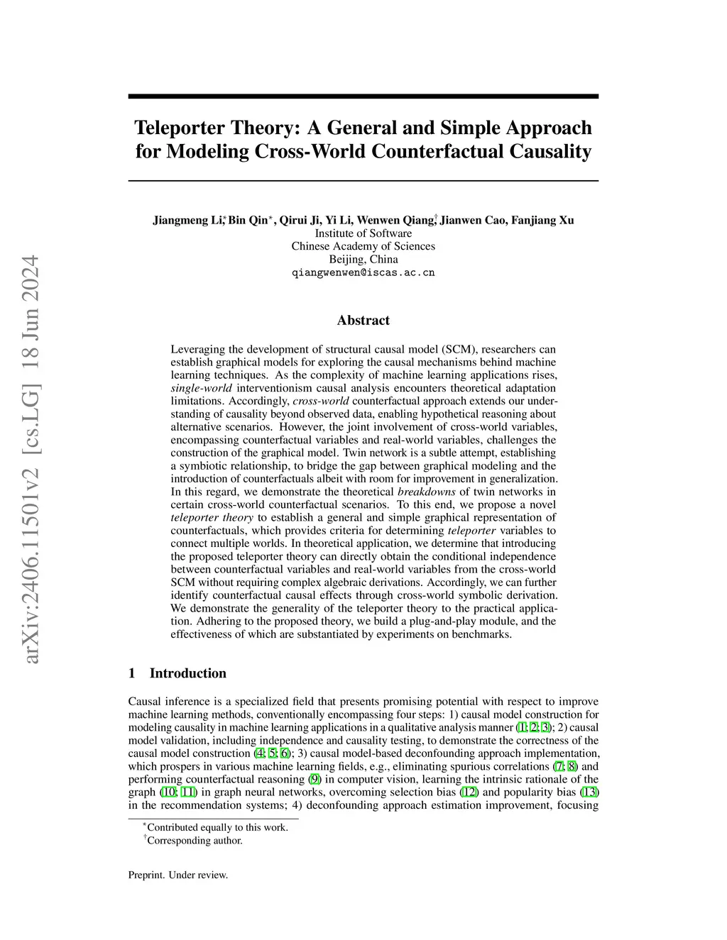 Leveraging the development of structural causal model (SCM), researchers can establish graphical models for exploring the causal mechanisms behind machine learning techniques. As the complexity of machine learning applications rises, single-world interventionism causal analysis encounters theoretical adaptation limitations. Accordingly, cross-world counterfactual approach extends our understanding of causality beyond observed data, enabling hypothetical reasoning about alternative scenarios. However, the joint involvement of cross-world variables, encompassing counterfactual variables and real-world variables, challenges the construction of the graphical model. Twin network is a subtle attempt, establishing a symbiotic relationship, to bridge the gap between graphical modeling and the introduction of counterfactuals albeit with room for improvement in generalization. In this regard, we demonstrate the theoretical breakdowns of twin networks in certain cross-world counterfactual scenarios. To this end, we propose a novel teleporter theory to establish a general and simple graphical representation of counterfactuals, which provides criteria for determining teleporter variables to connect multiple worlds. In theoretical application, we determine that introducing the proposed teleporter theory can directly obtain the conditional independence between counterfactual variables and real-world variables from the cross-world SCM without requiring complex algebraic derivations. Accordingly, we can further identify counterfactual causal effects through cross-world symbolic derivation. We demonstrate the generality of the teleporter theory to the practical application. Adhering to the proposed theory, we build a plug-and-play module, and the effectiveness of which are substantiated by experiments on benchmarks.