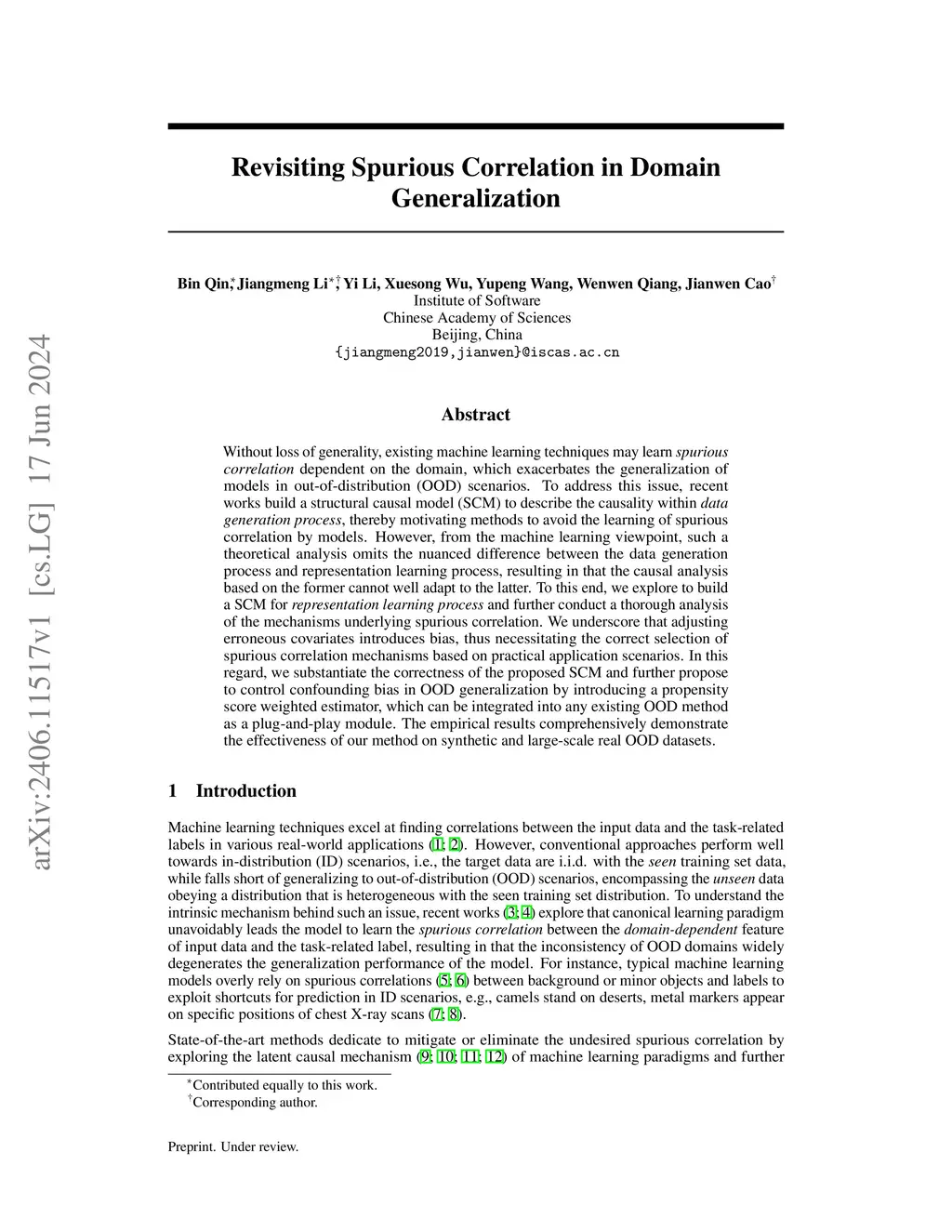 Without loss of generality, existing machine learning techniques may learn spurious correlation dependent on the domain, which exacerbates the generalization of models in out-of-distribution (OOD) scenarios. To address this issue, recent works build a structural causal model (SCM) to describe the causality within data generation process, thereby motivating methods to avoid the learning of spurious correlation by models. However, from the machine learning viewpoint, such a theoretical analysis omits the nuanced difference between the data generation process and representation learning process, resulting in that the causal analysis based on the former cannot well adapt to the latter. To this end, we explore to build a SCM for representation learning process and further conduct a thorough analysis of the mechanisms underlying spurious correlation. We underscore that adjusting erroneous covariates introduces bias, thus necessitating the correct selection of spurious correlation mechanisms based on practical application scenarios. In this regard, we substantiate the correctness of the proposed SCM and further propose to control confounding bias in OOD generalization by introducing a propensity score weighted estimator, which can be integrated into any existing OOD method as a plug-and-play module. The empirical results comprehensively demonstrate the effectiveness of our method on synthetic and large-scale real OOD datasets.