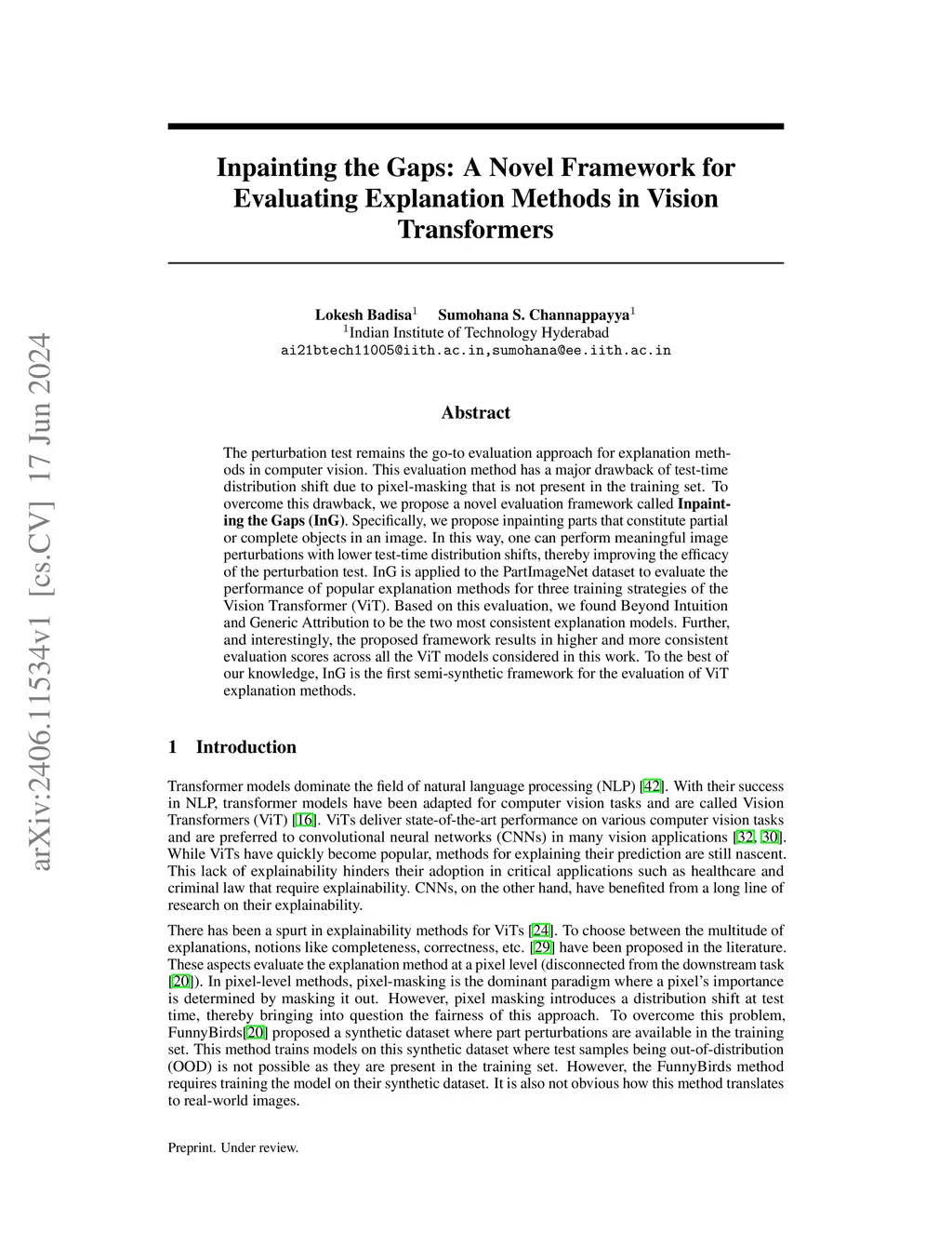 The perturbation test remains the go-to evaluation approach for explanation methods in computer vision. This evaluation method has a major drawback of test-time distribution shift due to pixel-masking that is not present in the training set. To overcome this drawback, we propose a novel evaluation framework called \textbf{Inpainting the Gaps (InG)}. Specifically, we propose inpainting parts that constitute partial or complete objects in an image. In this way, one can perform meaningful image perturbations with lower test-time distribution shifts, thereby improving the efficacy of the perturbation test. InG is applied to the PartImageNet dataset to evaluate the performance of popular explanation methods for three training strategies of the Vision Transformer (ViT). Based on this evaluation, we found Beyond Intuition and Generic Attribution to be the two most consistent explanation models. Further, and interestingly, the proposed framework results in higher and more consistent evaluation scores across all the ViT models considered in this work. To the best of our knowledge, InG is the first semi-synthetic framework for the evaluation of ViT explanation methods.
