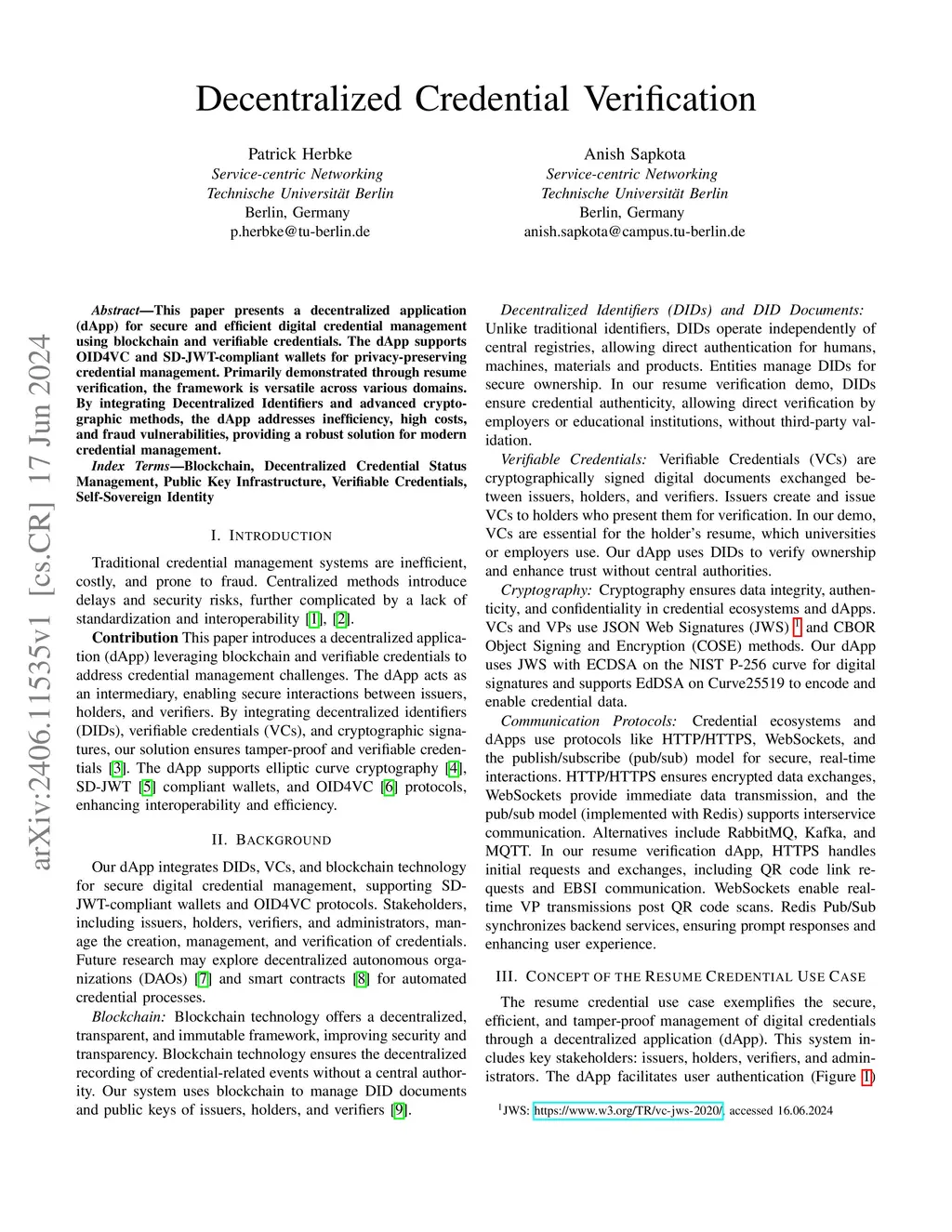 Lifecycle Management of Resumés with Decentralized Identifiers and