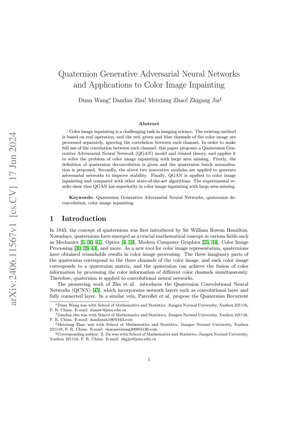Color image inpainting is a challenging task in imaging science. The existing method is based on real operation, and the red, green and blue channels of the color image are processed separately, ignoring the correlation between each channel. In order to make full use of the correlation between each channel, this paper proposes a Quaternion Generative Adversarial Neural Network (QGAN) model and related theory, and applies it to solve the problem of color image inpainting with large area missing. Firstly, the definition of quaternion deconvolution is given and the quaternion batch normalization is proposed. Secondly, the above two innovative modules are applied to generate adversarial networks to improve stability. Finally, QGAN is applied to color image inpainting and compared with other state-of-the-art algorithms. The experimental results show that QGAN has superiority in color image inpainting with large area missing.