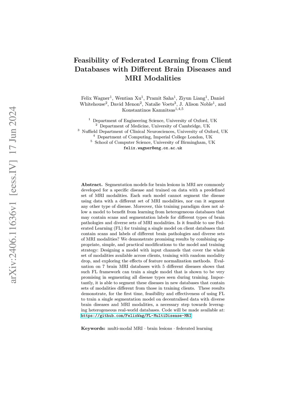 Segmentation models for brain lesions in MRI are commonly developed for a specific disease and trained on data with a predefined set of MRI modalities. Each such model cannot segment the disease using data with a different set of MRI modalities, nor can it segment any other type of disease. Moreover, this training paradigm does not allow a model to benefit from learning from heterogeneous databases that may contain scans and segmentation labels for different types of brain pathologies and diverse sets of MRI modalities. Additionally, the sensitivity of patient data often prevents centrally aggregating data, necessitating a decentralized approach. Is it feasible to use Federated Learning (FL) to train a single model on client databases that contain scans and labels of different brain pathologies and diverse sets of MRI modalities? We demonstrate promising results by combining appropriate, simple, and practical modifications to the model and training strategy: Designing a model with input channels that cover the whole set of modalities available across clients, training with random modality drop, and exploring the effects of feature normalization methods. Evaluation on 7 brain MRI databases with 5 different diseases shows that such FL framework can train a single model that is shown to be very promising in segmenting all disease types seen during training. Importantly, it is able to segment these diseases in new databases that contain sets of modalities different from those in training clients. These results demonstrate, for the first time, the feasibility and effectiveness of using Federated Learning to train a single 3D segmentation model on decentralised data with diverse brain diseases and MRI modalities, a necessary step towards leveraging heterogeneous real-world databases. Code will be made available at: https://github.com/FelixWag/FL-MultiDisease-MRI