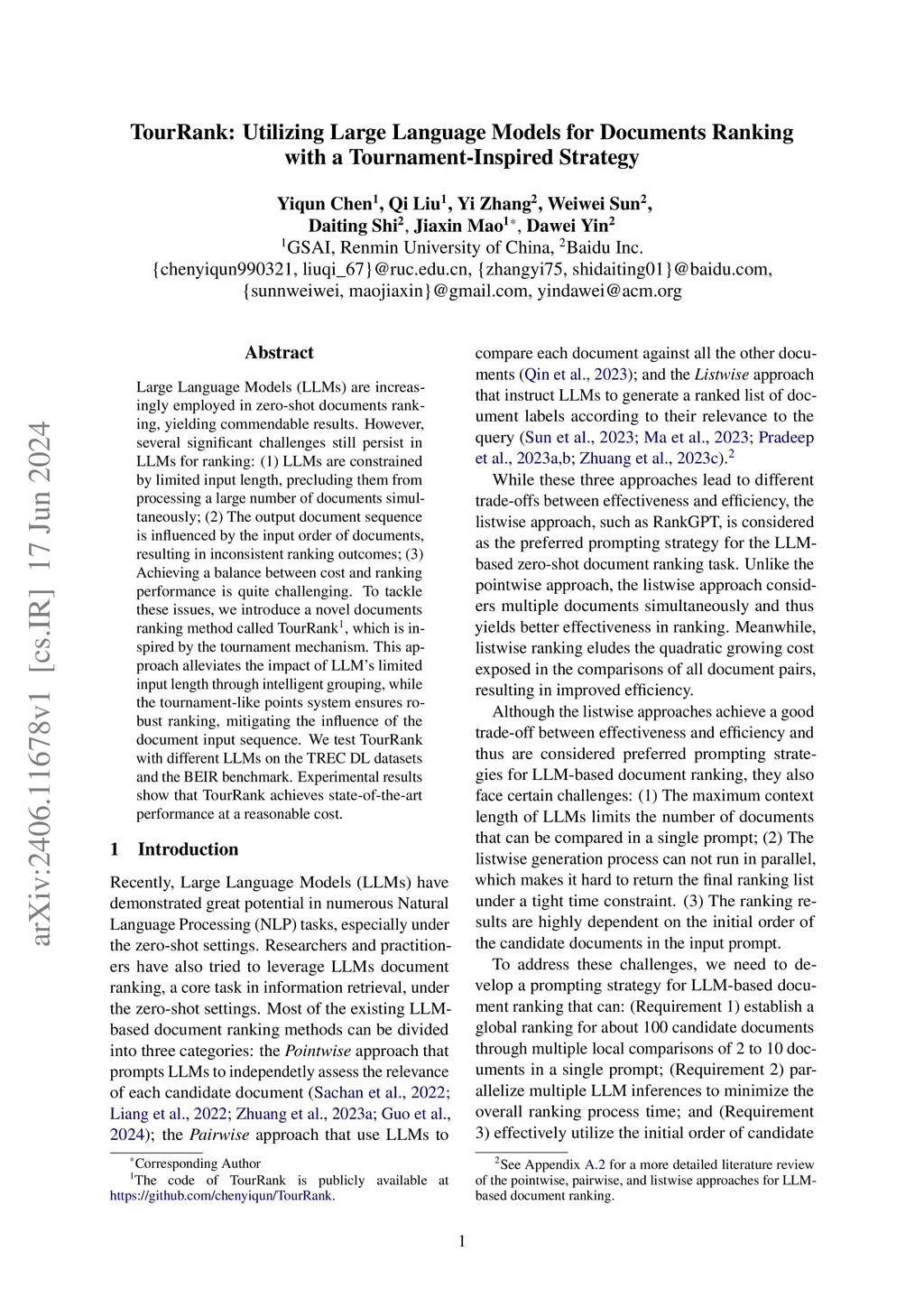 Large Language Models (LLMs) are increasingly employed in zero-shot documents ranking, yielding commendable results. However, several significant challenges still persist in LLMs for ranking: (1) LLMs are constrained by limited input length, precluding them from processing a large number of documents simultaneously; (2) The output document sequence is influenced by the input order of documents, resulting in inconsistent ranking outcomes; (3) Achieving a balance between cost and ranking performance is challenging. To tackle these issues, we introduce a novel documents ranking method called TourRank, which is inspired by the sport tournaments, such as FIFA World Cup. Specifically, we 1) overcome the limitation in input length and reduce the ranking latency by incorporating a multi-stage grouping strategy similar to the parallel group stage of sport tournaments; 2) improve the ranking performance and robustness to input orders by using a points system to ensemble multiple ranking results. We test TourRank with different LLMs on the TREC DL datasets and the BEIR benchmark. The experimental results demonstrate that TourRank delivers state-of-the-art performance at a modest cost. The code of TourRank can be seen onthis https URL.