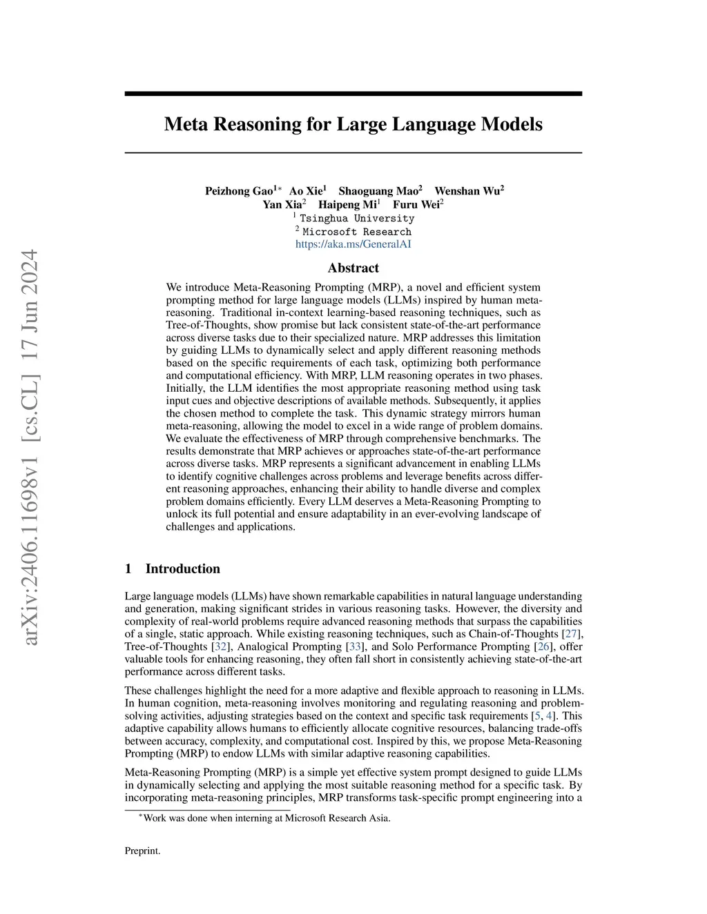 We introduce Meta-Reasoning Prompting (MRP), a novel and efficient system prompting method for large language models (LLMs) inspired by human meta-reasoning. Traditional in-context learning-based reasoning techniques, such as Tree-of-Thoughts, show promise but lack consistent state-of-the-art performance across diverse tasks due to their specialized nature. MRP addresses this limitation by guiding LLMs to dynamically select and apply different reasoning methods based on the specific requirements of each task, optimizing both performance and computational efficiency. With MRP, LLM reasoning operates in two phases. Initially, the LLM identifies the most appropriate reasoning method using task input cues and objective descriptions of available methods. Subsequently, it applies the chosen method to complete the task. This dynamic strategy mirrors human meta-reasoning, allowing the model to excel in a wide range of problem domains. We evaluate the effectiveness of MRP through comprehensive benchmarks. The results demonstrate that MRP achieves or approaches state-of-the-art performance across diverse tasks. MRP represents a significant advancement in enabling LLMs to identify cognitive challenges across problems and leverage benefits across different reasoning approaches, enhancing their ability to handle diverse and complex problem domains efficiently. Every LLM deserves a Meta-Reasoning Prompting to unlock its full potential and ensure adaptability in an ever-evolving landscape of challenges and applications.