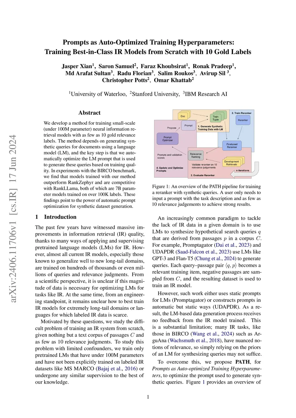We develop a method for training small-scale (under 100M parameter) neural information retrieval models with as few as 10 gold relevance labels. The method depends on generating synthetic queries for documents using a language model (LM), and the key step is that we automatically optimize the LM prompt that is used to generate these queries based on training quality. In experiments with the BIRCO benchmark, we find that models trained with our method outperform RankZephyr and are competitive with RankLLama, both of which are 7B parameter models trained on over 100K labels. These findings point to the power of automatic prompt optimization for synthetic dataset generation.