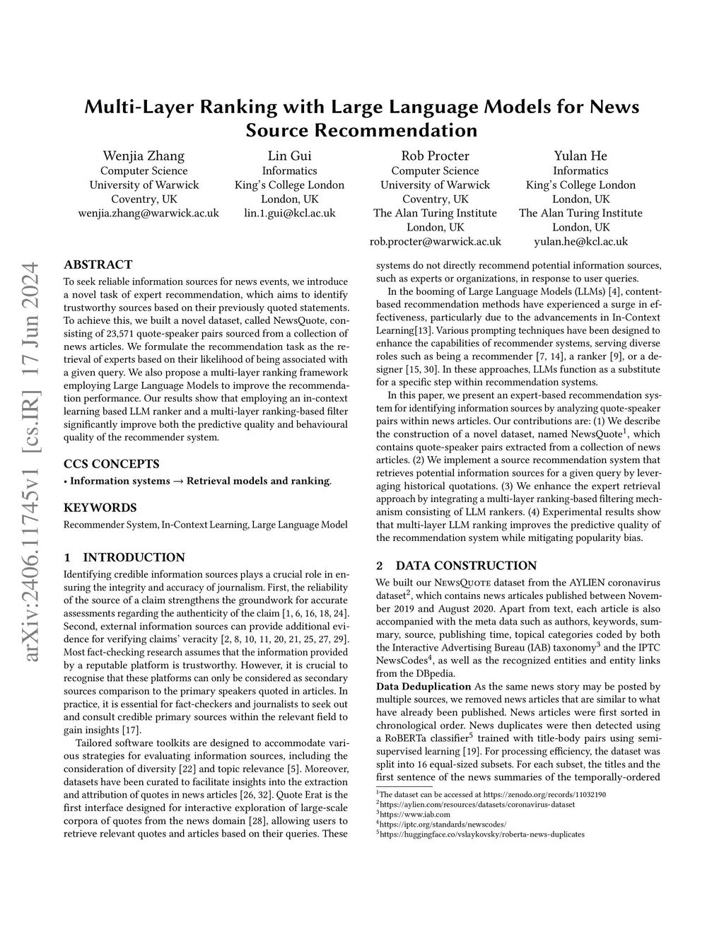 To seek reliable information sources for news events, we introduce a novel task of expert recommendation, which aims to identify trustworthy sources based on their previously quoted statements. To achieve this, we built a novel dataset, called NewsQuote, consisting of 23,571 quote-speaker pairs sourced from a collection of news articles. We formulate the recommendation task as the retrieval of experts based on their likelihood of being associated with a given query. We also propose a multi-layer ranking framework employing Large Language Models to improve the recommendation performance. Our results show that employing an in-context learning based LLM ranker and a multi-layer ranking-based filter significantly improve both the predictive quality and behavioural quality of the recommender system.