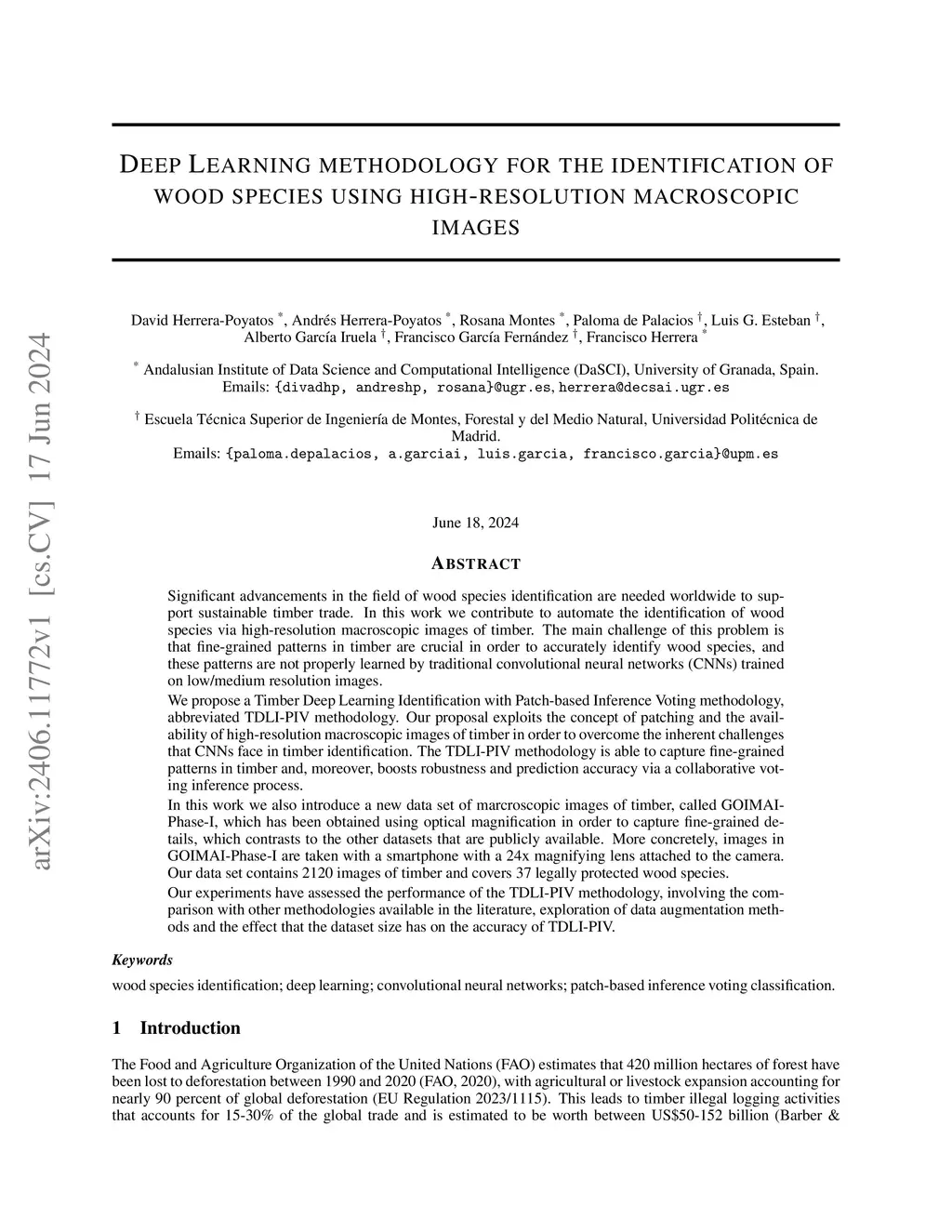Significant advancements in the field of wood species identification are needed worldwide to support sustainable timber trade. In this work we contribute to automate the identification of wood species via high-resolution macroscopic images of timber. The main challenge of this problem is that fine-grained patterns in timber are crucial in order to accurately identify wood species, and these patterns are not properly learned by traditional convolutional neural networks (CNNs) trained on low/medium resolution images. We propose a Timber Deep Learning Identification with Patch-based Inference Voting methodology, abbreviated TDLI-PIV methodology. Our proposal exploits the concept of patching and the availability of high-resolution macroscopic images of timber in order to overcome the inherent challenges that CNNs face in timber identification. The TDLI-PIV methodology is able to capture fine-grained patterns in timber and, moreover, boosts robustness and prediction accuracy via a collaborative voting inference process. In this work we also introduce a new data set of marcroscopic images of timber, called GOIMAI-Phase-I, which has been obtained using optical magnification in order to capture fine-grained details, which contrasts to the other datasets that are publicly available. More concretely, images in GOIMAI-Phase-I are taken with a smartphone with a 24x magnifying lens attached to the camera. Our data set contains 2120 images of timber and covers 37 legally protected wood species. Our experiments have assessed the performance of the TDLI-PIV methodology, involving the comparison with other methodologies available in the literature, exploration of data augmentation methods and the effect that the dataset size has on the accuracy of TDLI-PIV.