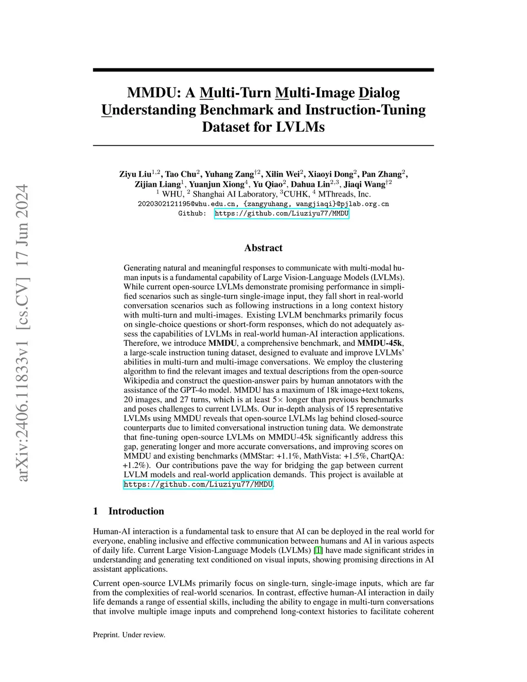 Generating natural and meaningful responses to communicate with multi-modal human inputs is a fundamental capability of Large Vision-Language Models(LVLMs). While current open-source LVLMs demonstrate promising performance in simplified scenarios such as single-turn single-image input, they fall short in real-world conversation scenarios such as following instructions in a long context history with multi-turn and multi-images. Existing LVLM benchmarks primarily focus on single-choice questions or short-form responses, which do not adequately assess the capabilities of LVLMs in real-world human-AI interaction applications. Therefore, we introduce MMDU, a comprehensive benchmark, and MMDU-45k, a large-scale instruction tuning dataset, designed to evaluate and improve LVLMs' abilities in multi-turn and multi-image conversations. We employ the clustering algorithm to ffnd the relevant images and textual descriptions from the open-source Wikipedia and construct the question-answer pairs by human annotators with the assistance of the GPT-4o model. MMDU has a maximum of 18k image+text tokens, 20 images, and 27 turns, which is at least 5x longer than previous benchmarks and poses challenges to current LVLMs. Our in-depth analysis of 15 representative LVLMs using MMDU reveals that open-source LVLMs lag behind closed-source counterparts due to limited conversational instruction tuning data. We demonstrate that ffne-tuning open-source LVLMs on MMDU-45k signiffcantly address this gap, generating longer and more accurate conversations, and improving scores on MMDU and existing benchmarks (MMStar: +1.1%, MathVista: +1.5%, ChartQA:+1.2%). Our contributions pave the way for bridging the gap between current LVLM models and real-world application demands. This project is available at https://github.com/Liuziyu77/MMDU.