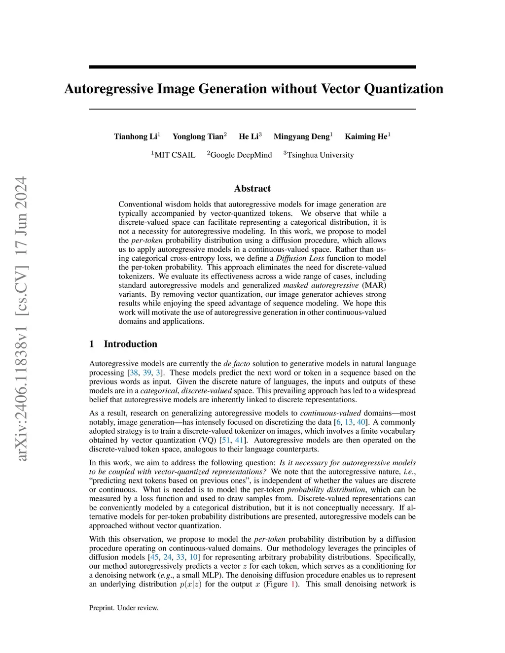 Conventional wisdom holds that autoregressive models for image generation are typically accompanied by vector-quantized tokens. We observe that while a discrete-valued space can facilitate representing a categorical distribution, it is not a necessity for autoregressive modeling. In this work, we propose to model the per-token probability distribution using a diffusion procedure, which allows us to apply autoregressive models in a continuous-valued space. Rather than using categorical cross-entropy loss, we define a Diffusion Loss function to model the per-token probability. This approach eliminates the need for discrete-valued tokenizers. We evaluate its effectiveness across a wide range of cases, including standard autoregressive models and generalized masked autoregressive (MAR) variants. By removing vector quantization, our image generator achieves strong results while enjoying the speed advantage of sequence modeling. We hope this work will motivate the use of autoregressive generation in other continuous-valued domains and applications. Code is available at: https://github.com/LTH14/mar