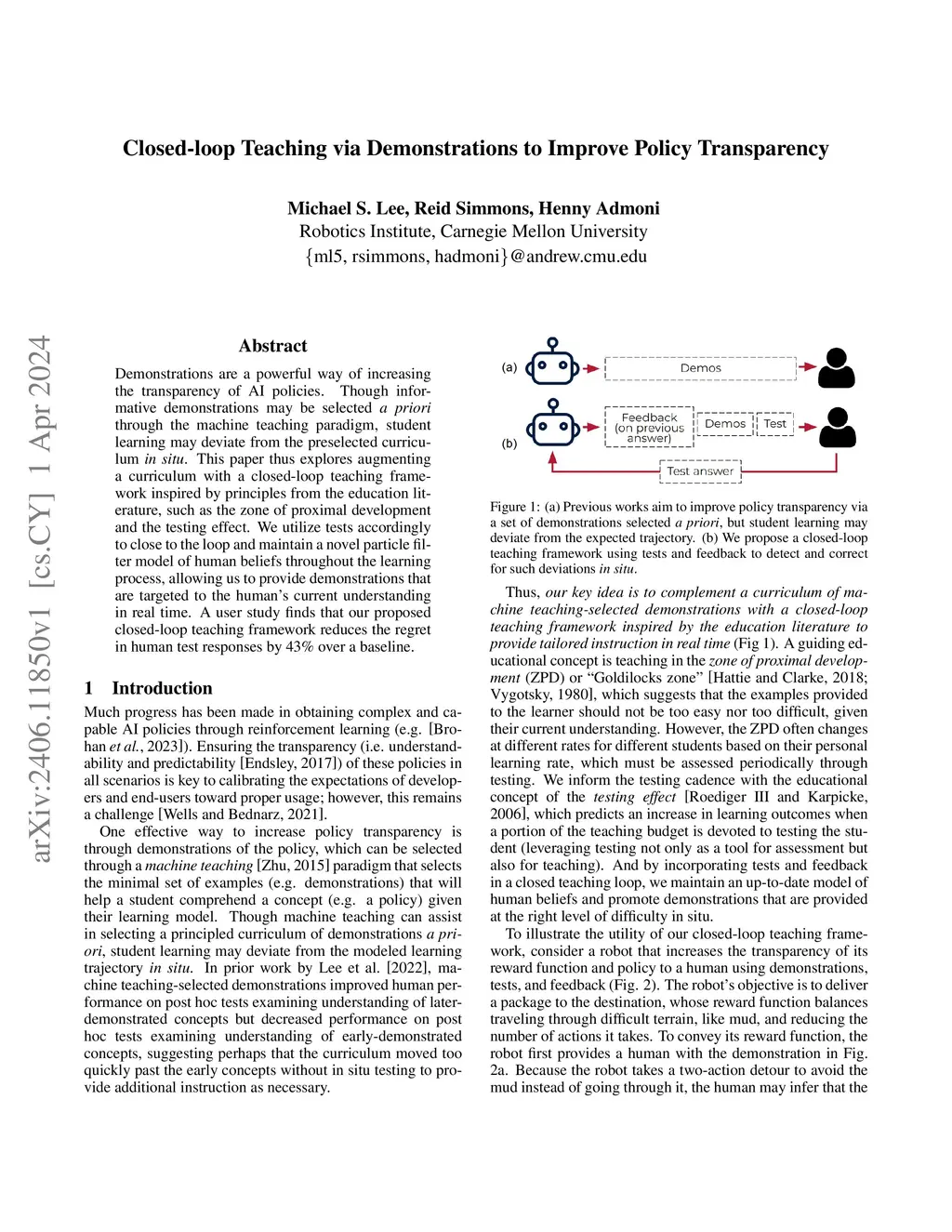 Closed-loop Teaching via Demonstrations to Improve Policy Transparency