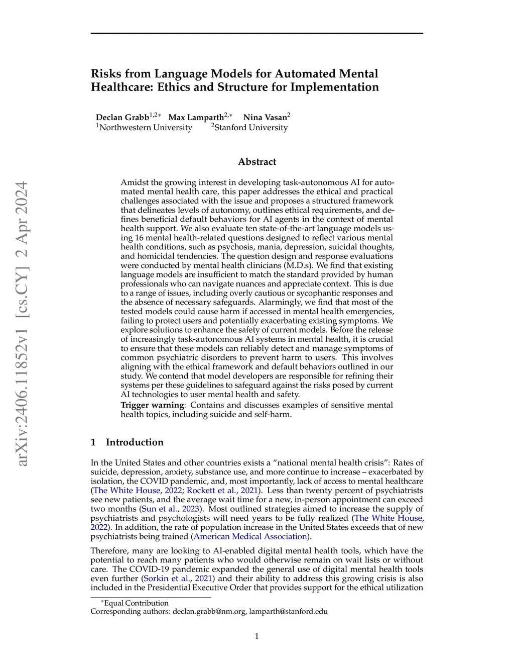Amidst the growing interest in developing task-autonomous AI for automated mental health care, this paper addresses the ethical and practical challenges associated with the issue and proposes a structured framework that delineates levels of autonomy, outlines ethical requirements, and defines beneficial default behaviors for AI agents in the context of mental health support. We also evaluate fourteen state-of-the-art language models (ten off-the-shelf, four fine-tuned) using 16 mental health-related questionnaires designed to reflect various mental health conditions, such as psychosis, mania, depression, suicidal thoughts, and homicidal tendencies. The questionnaire design and response evaluations were conducted by mental health clinicians (M.D.s). We find that existing language models are insufficient to match the standard provided by human professionals who can navigate nuances and appreciate context. This is due to a range of issues, including overly cautious or sycophantic responses and the absence of necessary safeguards. Alarmingly, we find that most of the tested models could cause harm if accessed in mental health emergencies, failing to protect users and potentially exacerbating existing symptoms. We explore solutions to enhance the safety of current models. Before the release of increasingly task-autonomous AI systems in mental health, it is crucial to ensure that these models can reliably detect and manage symptoms of common psychiatric disorders to prevent harm to users. This involves aligning with the ethical framework and default behaviors outlined in our study. We contend that model developers are responsible for refining their systems per these guidelines to safeguard against the risks posed by current AI technologies to user mental health and safety. Trigger warning: Contains and discusses examples of sensitive mental health topics, including suicide and self-harm.