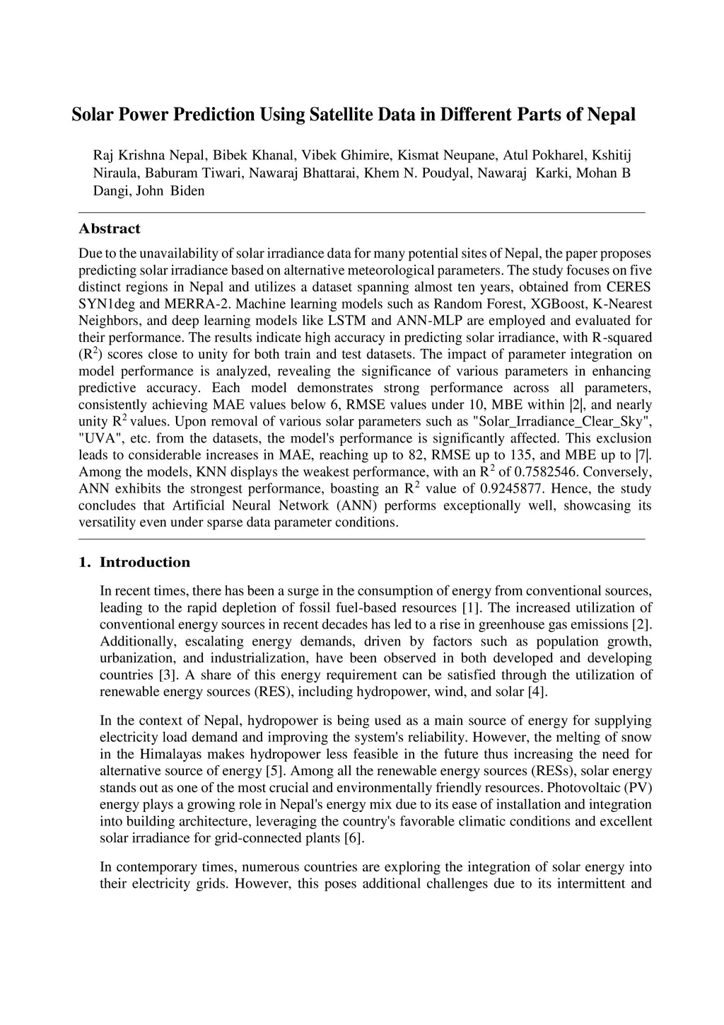 Solar Power Prediction Using Satellite Data in Different Parts of Nepal