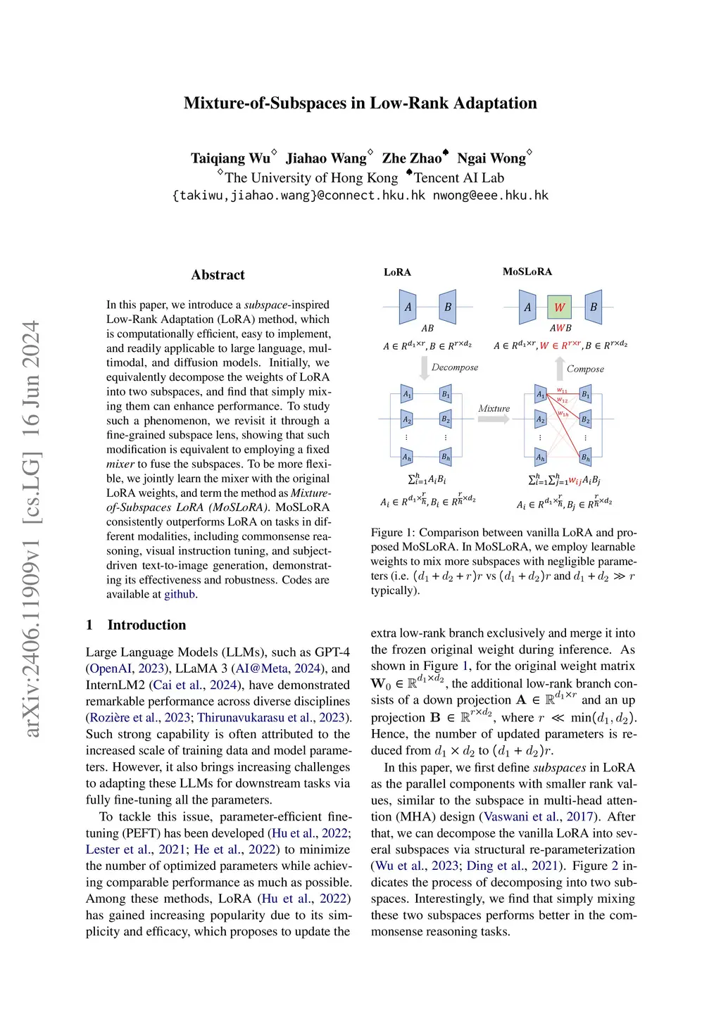 In this paper, we introduce a subspace-inspired Low-Rank Adaptation (LoRA) method, which is computationally efficient, easy to implement, and readily applicable to large language, multimodal, and diffusion models. Initially, we equivalently decompose the weights of LoRA into two subspaces, and find that simply mixing them can enhance performance. To study such a phenomenon, we revisit it through a fine-grained subspace lens, showing that such modification is equivalent to employing a fixed mixer to fuse the subspaces. To be more flexible, we jointly learn the mixer with the original LoRA weights, and term the method Mixture-of-Subspaces LoRA (MoSLoRA). MoSLoRA consistently outperforms LoRA on tasks in different modalities, including commonsense reasoning, visual instruction tuning, and subject-driven text-to-image generation, demonstrating its effectiveness and robustness. Codes are available atthis https URL.