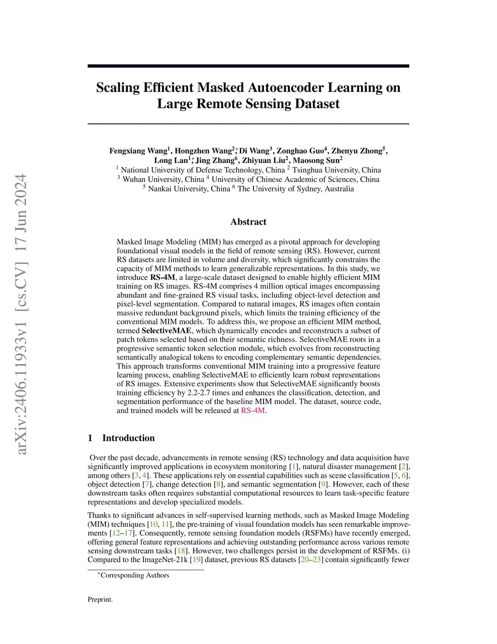 Masked Image Modeling (MIM) has become an essential method for building foundational visual models in remote sensing (RS). However, the limitations in size and diversity of existing RS datasets restrict the ability of MIM methods to learn generalizable representations. Additionally, conventional MIM techniques, which require reconstructing all tokens, introduce unnecessary computational overhead. To address these issues, we present a new pre-training pipeline for RS models, featuring the creation of a large-scale RS dataset and an efficient MIM approach. We curated a high-quality dataset named OpticalRS-4M by collecting publicly available RS datasets and processing them through exclusion, slicing, and deduplication. OpticalRS-4M comprises 4 million optical images covering various RS tasks, such as object detection and pixel segmentation. To enhance efficiency, we propose SelectiveMAE, a pre-training method that dynamically encodes and reconstructs semantically rich patch tokens, thereby reducing the inefficiencies of traditional MIM models caused by redundant background pixels in RS images. Extensive experiments demonstrate that OpticalRS-4M significantly improves classification, detection, and segmentation performance, while SelectiveMAE increases training efficiency over 2 times. This highlights the effectiveness and scalability of our pipeline in developing RS foundational models.