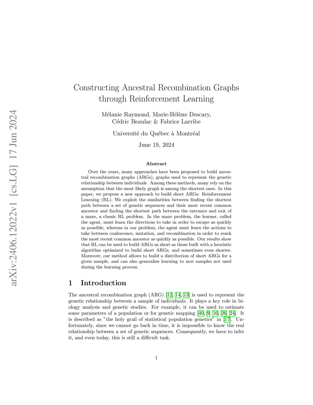 Over the years, many approaches have been proposed to build ancestral recombination graphs (ARGs), graphs used to represent the genetic relationship between individuals. Among these methods, many rely on the assumption that the most likely graph is among the shortest ones. In this paper, we propose a new approach to build short ARGs: Reinforcement Learning (RL). We exploit the similarities between finding the shortest path between a set of genetic sequences and their most recent common ancestor and finding the shortest path between the entrance and exit of a maze, a classic RL problem. In the maze problem, the learner, called the agent, must learn the directions to take in order to escape as quickly as possible, whereas in our problem, the agent must learn the actions to take between coalescence, mutation, and recombination in order to reach the most recent common ancestor as quickly as possible. Our results show that RL can be used to build ARGs as short as those built with a heuristic algorithm optimized to build short ARGs, and sometimes even shorter. Moreover, our method allows to build a distribution of short ARGs for a given sample, and can also generalize learning to new samples not used during the learning process.