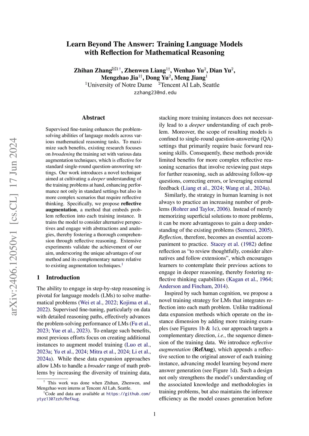 Supervised fine-tuning enhances the problem-solving abilities of language models across various mathematical reasoning tasks. To maximize such benefits, existing research focuses on broadening the training set with various data augmentation techniques, which is effective for standard single-round question-answering settings. Our work introduces a novel technique aimed at cultivating a deeper understanding of the training problems at hand, enhancing performance not only in standard settings but also in more complex scenarios that require reflective thinking. Specifically, we propose reflective augmentation, a method that embeds problem reflection into each training instance. It trains the model to consider alternative perspectives and engage with abstractions and analogies, thereby fostering a thorough comprehension through reflective reasoning. Extensive experiments validate the achievement of our aim, underscoring the unique advantages of our method and its complementary nature relative to existing augmentation techniques.