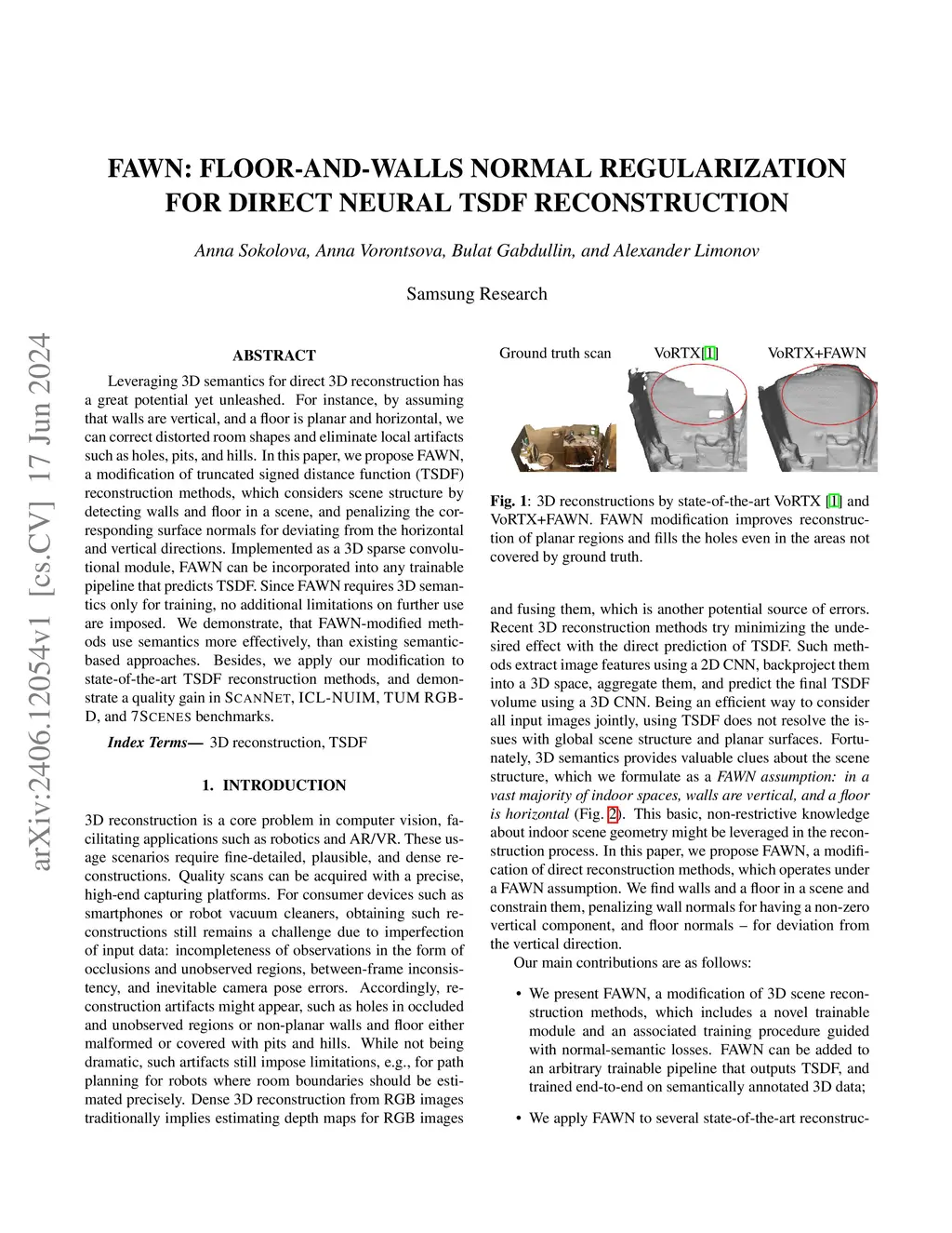 Leveraging 3D semantics for direct 3D reconstruction has a great potential yet unleashed. For instance, by assuming that walls are vertical, and a floor is planar and horizontal, we can correct distorted room shapes and eliminate local artifacts such as holes, pits, and hills. In this paper, we propose FAWN, a modification of truncated signed distance function (TSDF) reconstruction methods, which considers scene structure by detecting walls and floor in a scene, and penalizing the corresponding surface normals for deviating from the horizontal and vertical directions. Implemented as a 3D sparse convolutional module, FAWN can be incorporated into any trainable pipeline that predicts TSDF. Since FAWN requires 3D semantics only for training, no additional limitations on further use are imposed. We demonstrate, that FAWN-modified methods use semantics more effectively, than existing semantic-based approaches. Besides, we apply our modification to state-of-the-art TSDF reconstruction methods, and demonstrate a quality gain in SCANNET, ICL-NUIM, TUM RGB-D, and 7SCENES benchmarks.