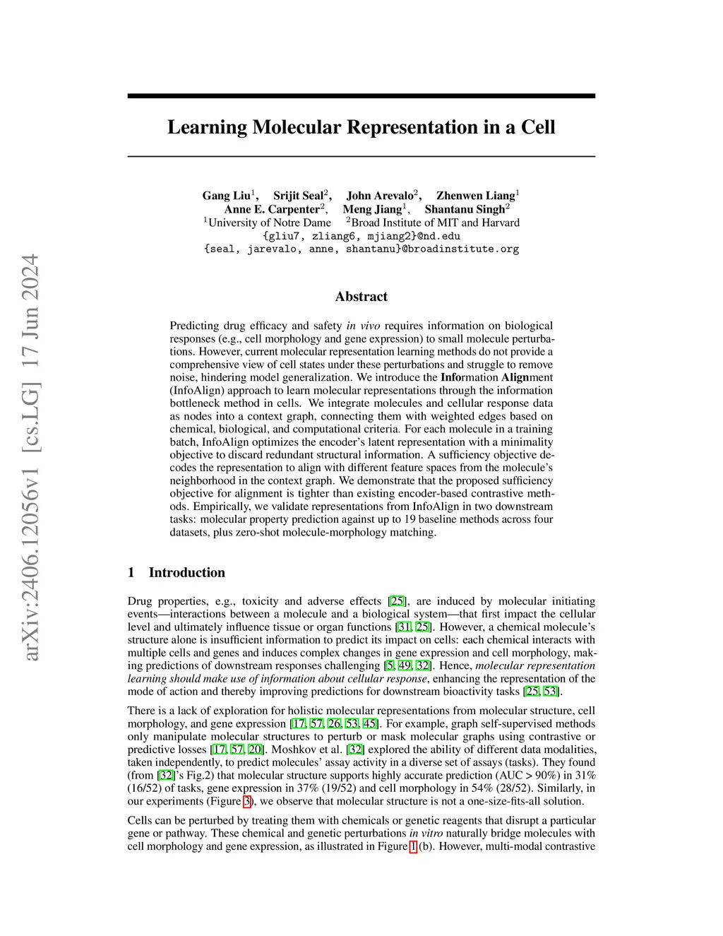 Predicting drug efficacy and safety in vivo requires information on biological responses (e.g., cell morphology and gene expression) to small molecule perturbations. However, current molecular representation learning methods do not provide a comprehensive view of cell states under these perturbations and struggle to remove noise, hindering model generalization. We introduce the Information Alignment (InfoAlign) approach to learn molecular representations through the information bottleneck method in cells. We integrate molecules and cellular response data as nodes into a context graph, connecting them with weighted edges based on chemical, biological, and computational criteria. For each molecule in a training batch, InfoAlign optimizes the encoder's latent representation with a minimality objective to discard redundant structural information. A sufficiency objective decodes the representation to align with different feature spaces from the molecule's neighborhood in the context graph. We demonstrate that the proposed sufficiency objective for alignment is tighter than existing encoder-based contrastive methods. Empirically, we validate representations from InfoAlign in two downstream tasks: molecular property prediction against up to 19 baseline methods across four datasets, plus zero-shot molecule-morphology matching.