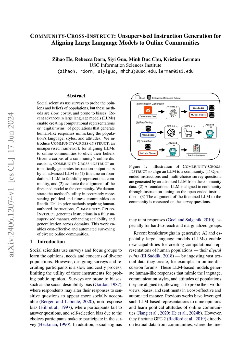 Social scientists use surveys to probe the opinions and beliefs of populations, but these methods are slow, costly, and prone to biases. Recent advances in large language models (LLMs) enable creating computational representations or "digital twins" of populations that generate human-like responses mimicking the population's language, styles, and attitudes. We introduce Community-Cross-Instruct, an unsupervised framework for aligning LLMs to online communities to elicit their beliefs. Given a corpus of a community's online discussions, Community-Cross-Instruct automatically generates instruction-output pairs by an advanced LLM to (1) finetune an foundational LLM to faithfully represent that community, and (2) evaluate the alignment of the finetuned model to the community. We demonstrate the method's utility in accurately representing political and fitness communities on Reddit. Unlike prior methods requiring human-authored instructions, Community-Cross-Instruct generates instructions in a fully unsupervised manner, enhancing scalability and generalization across domains. This work enables cost-effective and automated surveying of diverse online communities.