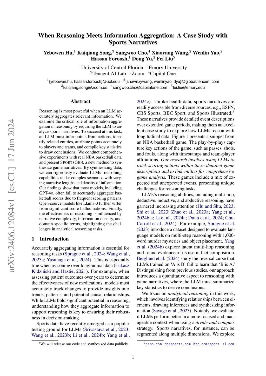 Reasoning is most powerful when an LLM accurately aggregates relevant information. We examine the critical role of information aggregation in reasoning by requiring the LLM to analyze sports narratives. To succeed at this task, an LLM must infer points from actions, identify related entities, attribute points accurately to players and teams, and compile key statistics to draw conclusions. We conduct comprehensive experiments with real NBA basketball data and present SportsGen, a new method to synthesize game narratives. By synthesizing data, we can rigorously evaluate LLMs' reasoning capabilities under complex scenarios with varying narrative lengths and density of information. Our findings show that most models, including GPT-4o, often fail to accurately aggregate basketball scores due to frequent scoring patterns. Open-source models like Llama-3 further suffer from significant score hallucinations. Finally, the effectiveness of reasoning is influenced by narrative complexity, information density, and domain-specific terms, highlighting the challenges in analytical reasoning tasks.