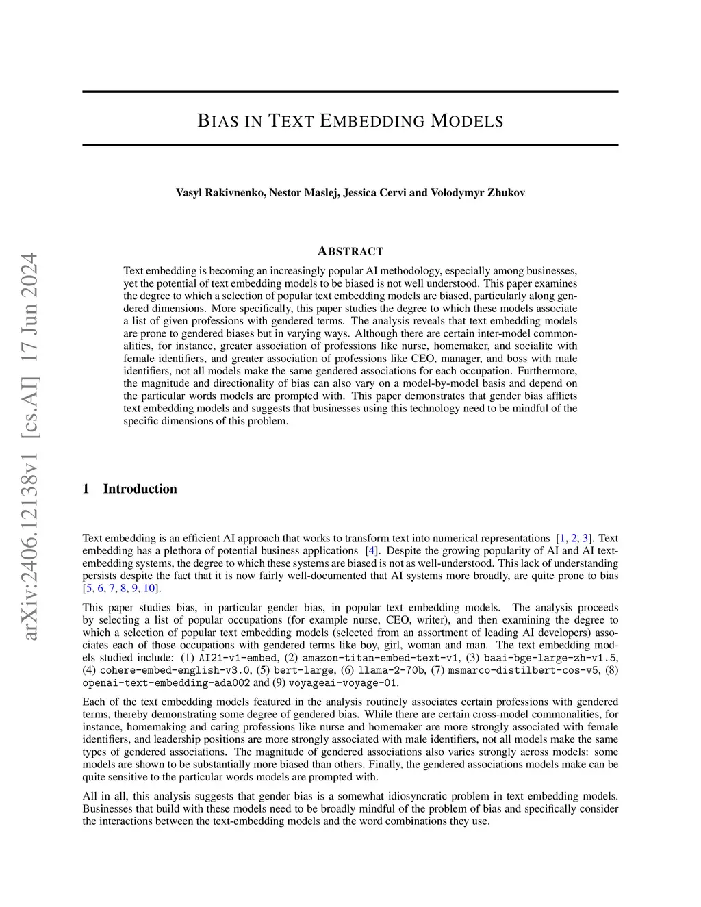 Text embedding is becoming an increasingly popular AI methodology, especially among businesses, yet the potential of text embedding models to be biased is not well understood. This paper examines the degree to which a selection of popular text embedding models are biased, particularly along gendered dimensions. More specifically, this paper studies the degree to which these models associate a list of given professions with gendered terms. The analysis reveals that text embedding models are prone to gendered biases but in varying ways. Although there are certain inter-model commonalities, for instance, greater association of professions like nurse, homemaker, and socialite with female identifiers, and greater association of professions like CEO, manager, and boss with male identifiers, not all models make the same gendered associations for each occupation. Furthermore, the magnitude and directionality of bias can also vary on a model-by-model basis and depend on the particular words models are prompted with. This paper demonstrates that gender bias afflicts text embedding models and suggests that businesses using this technology need to be mindful of the specific dimensions of this problem.