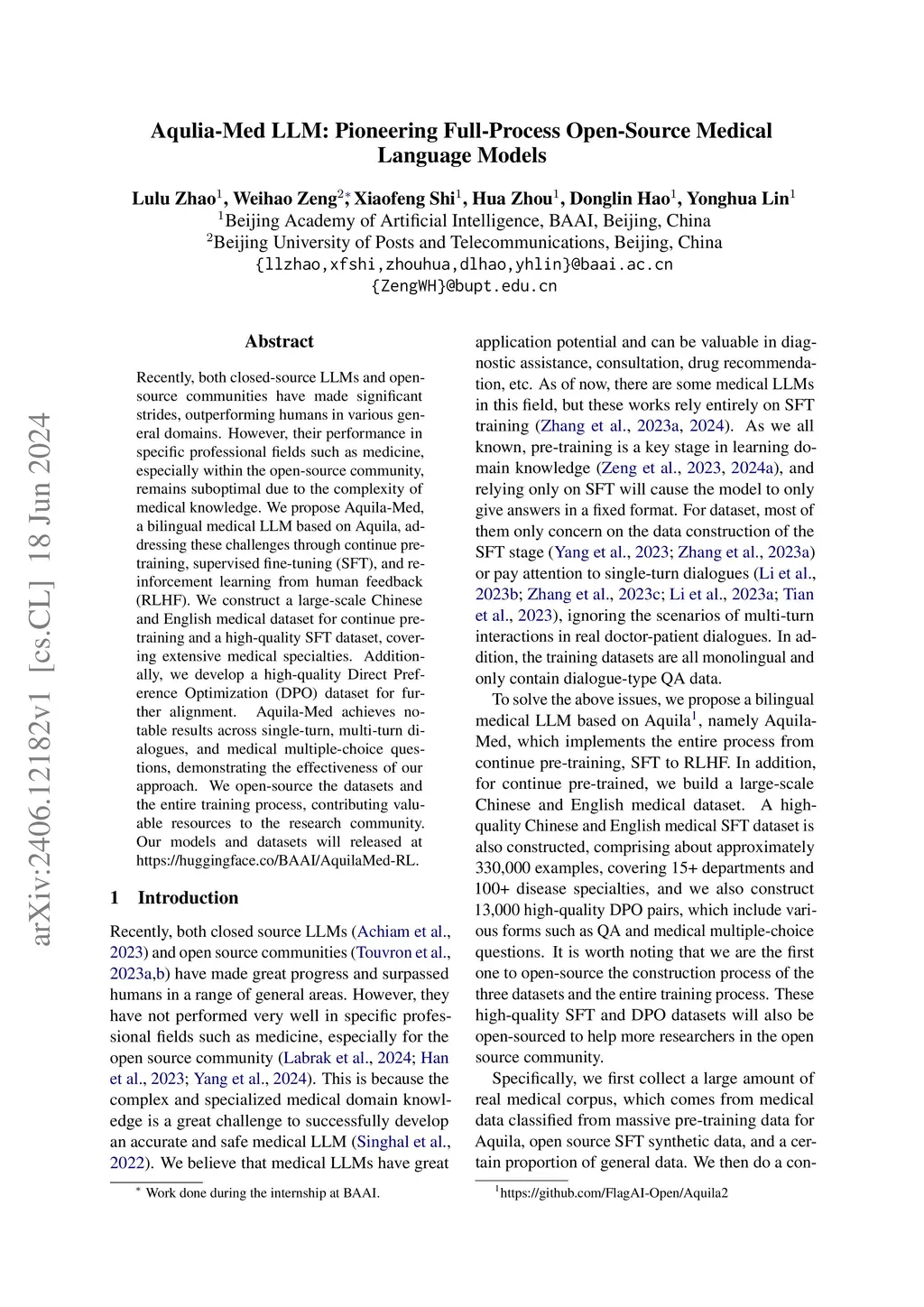 Recently, both closed-source LLMs and open-source communities have made significant strides, outperforming humans in various general domains. However, their performance in specific professional fields such as medicine, especially within the open-source community, remains suboptimal due to the complexity of medical knowledge. We propose Aquila-Med, a bilingual medical LLM based on Aquila, addressing these challenges through continue pre-training, supervised fine-tuning (SFT), and reinforcement learning from human feedback (RLHF). We construct a large-scale Chinese and English medical dataset for continue pre-training and a high-quality SFT dataset, covering extensive medical specialties. Additionally, we develop a high-quality Direct Preference Optimization (DPO) dataset for further alignment. Aquila-Med achieves notable results across single-turn, multi-turn dialogues, and medical multiple-choice questions, demonstrating the effectiveness of our approach. We open-source the datasets and the entire training process, contributing valuable resources to the research community. Our models and datasets will released at https://huggingface.co/BAAI/AquilaMed-RL.