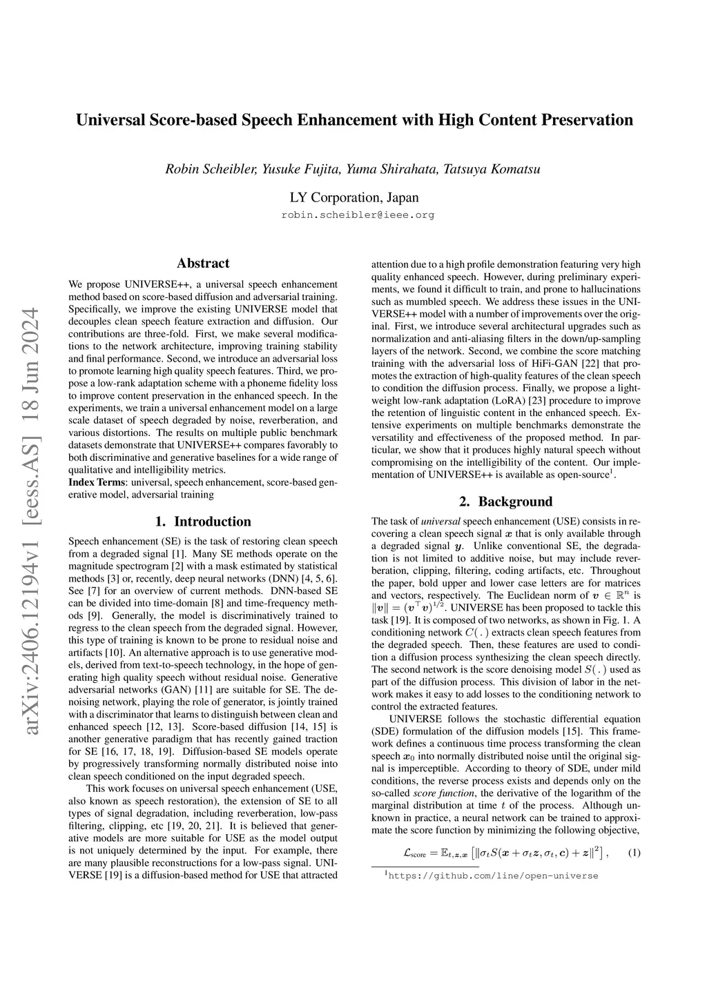 We propose UNIVERSE++, a universal speech enhancement method based on score-based diffusion and adversarial training. Specifically, we improve the existing UNIVERSE model that decouples clean speech feature extraction and diffusion. Our contributions are three-fold. First, we make several modifications to the network architecture, improving training stability and final performance. Second, we introduce an adversarial loss to promote learning high quality speech features. Third, we propose a low-rank adaptation scheme with a phoneme fidelity loss to improve content preservation in the enhanced speech. In the experiments, we train a universal enhancement model on a large scale dataset of speech degraded by noise, reverberation, and various distortions. The results on multiple public benchmark datasets demonstrate that UNIVERSE++ compares favorably to both discriminative and generative baselines for a wide range of qualitative and intelligibility metrics.