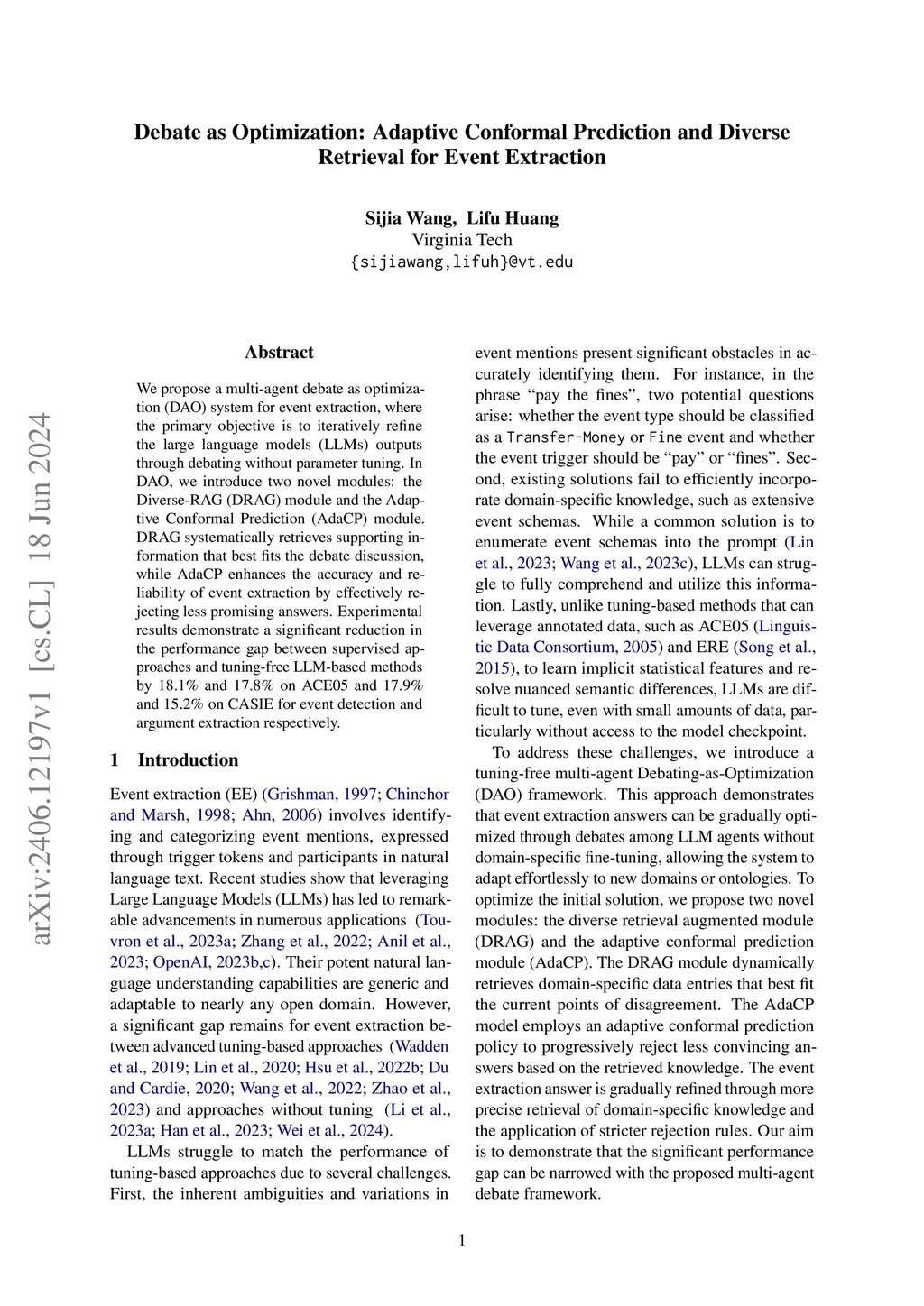 We propose a multi-agent debate as optimization (DAO) system for event extraction, where the primary objective is to iteratively refine the large language models (LLMs) outputs through debating without parameter tuning. In DAO, we introduce two novel modules: the Diverse-RAG (DRAG) module and the Adaptive Conformal Prediction (AdaCP) module. DRAG systematically retrieves supporting information that best fits the debate discussion, while AdaCP enhances the accuracy and reliability of event extraction by effectively rejecting less promising answers. Experimental results demonstrate a significant reduction in the performance gap between supervised approaches and tuning-free LLM-based methods by 18.1% and 17.8% on ACE05 and 17.9% and 15.2% on CASIE for event detection and argument extraction respectively.