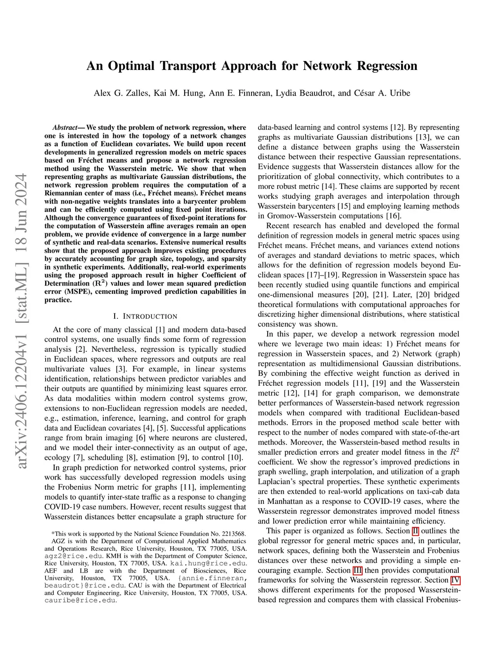 We study the problem of network regression, where one is interested in how the topology of a network changes as a function of Euclidean covariates. We build upon recent developments in generalized regression models on metric spaces based on Fr\échet means and propose a network regression method using the Wasserstein metric. We show that when representing graphs as multivariate Gaussian distributions, the network regression problem requires the computation of a Riemannian center of mass (i.e., Fr\échet means). Fr\échet means with non-negative weights translates into a barycenter problem and can be efficiently computed using fixed point iterations. Although the convergence guarantees of fixed-point iterations for the computation of Wasserstein affine averages remain an open problem, we provide evidence of convergence in a large number of synthetic and real-data scenarios. Extensive numerical results show that the proposed approach improves existing procedures by accurately accounting for graph size, topology, and sparsity in synthetic experiments. Additionally, real-world experiments using the proposed approach result in higher Coefficient of Determination () values and lower mean squared prediction error (MSPE), cementing improved prediction capabilities in practice.