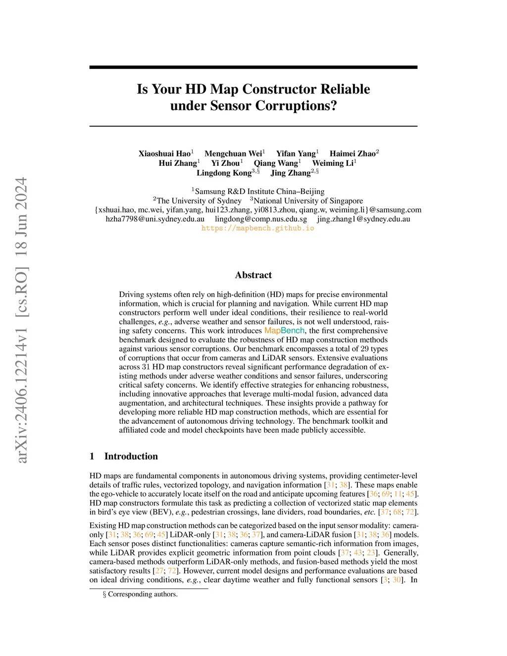 Driving systems often rely on high-definition (HD) maps for precise environmental information, which is crucial for planning and navigation. While current HD map constructors perform well under ideal conditions, their resilience to real-world challenges, \eg, adverse weather and sensor failures, is not well understood, raising safety concerns. This work introduces MapBench, the first comprehensive benchmark designed to evaluate the robustness of HD map construction methods against various sensor corruptions. Our benchmark encompasses a total of 29 types of corruptions that occur from cameras and LiDAR sensors. Extensive evaluations across 31 HD map constructors reveal significant performance degradation of existing methods under adverse weather conditions and sensor failures, underscoring critical safety concerns. We identify effective strategies for enhancing robustness, including innovative approaches that leverage multi-modal fusion, advanced data augmentation, and architectural techniques. These insights provide a pathway for developing more reliable HD map construction methods, which are essential for the advancement of autonomous driving technology. The benchmark toolkit and affiliated code and model checkpoints have been made publicly accessible.