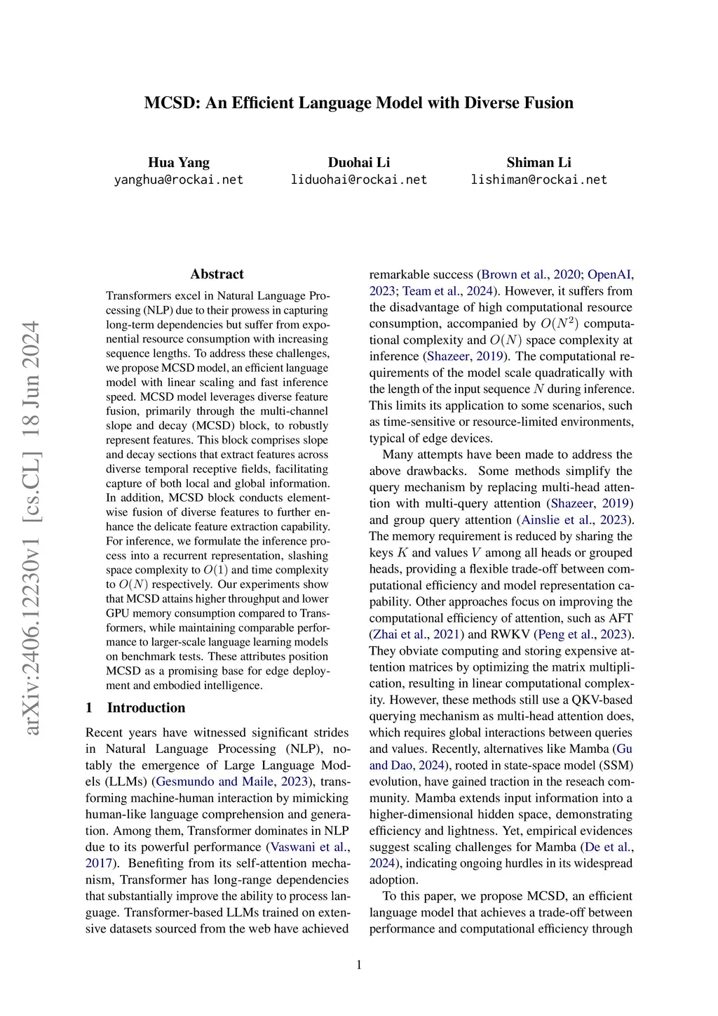 Transformers excel in Natural Language Processing (NLP) due to their prowess in capturing long-term dependencies but suffer from exponential resource consumption with increasing sequence lengths. To address these challenges, we propose MCSD model, an efficient language model with linear scaling and fast inference speed. MCSD model leverages diverse feature fusion, primarily through the multi-channel slope and decay (MCSD) block, to robustly represent features. This block comprises slope and decay sections that extract features across diverse temporal receptive fields, facilitating capture of both local and global information. In addition, MCSD block conducts element-wise fusion of diverse features to further enhance the delicate feature extraction capability. For inference, we formulate the inference process into a recurrent representation, slashing space complexity to O(1)O(1) and time complexity to O(N)O(N) respectively. Our experiments show that MCSD attains higher throughput and lower GPU memory consumption compared to Transformers, while maintaining comparable performance to larger-scale language learning models on benchmark tests. These attributes position MCSD as a promising base for edge deployment and embodied intelligence.